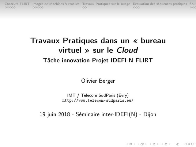 nuage Évaluation des séquences pratiques Sous Travaux Pratiques dans un bureau virtuel sur le Cloud Tâche innovation Projet IDEFI-N FLIRT Olivier Berger IMT / Télécom SudParis (Évry) http://www.telecom-sudparis.eu/ 19 juin 2018 - Séminaire inter-IDEFI(N) - Dijon