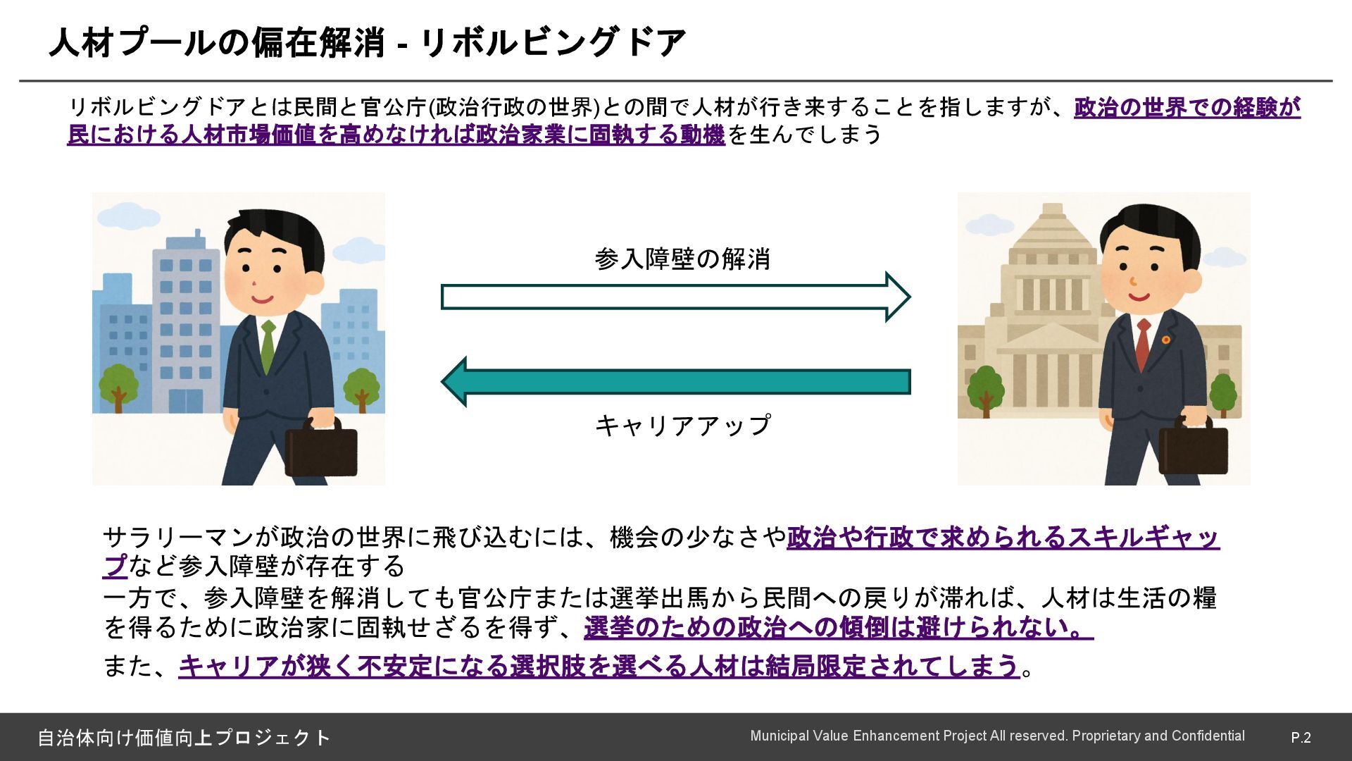 P.2 人材プールの偏在解消 - リボルビングドア リボルビングドアとは民間と官公庁(政治行政の世界)との間で人材が行き来することを指しますが、政治の世界での経験が 民における人材市場価値を高めなければ政治家業に固執する動機を生んでしまう サラリーマンが政治の世界に飛び込むには、機会の少なさや政治や行政で求められるスキルギャッ プなど参入障壁が存在する 一方で、参入障壁を解消しても官公庁または選挙出馬から民間への戻りが滞れば、人材は生活の糧 を得るために政治家に固執せざるを得ず、選挙のための政治への傾倒は避けられない。 また、キャリアが狭く不安定になる選択肢を選べる人材は結局限定されてしまう。 参入障壁の解消 キャリアアップ