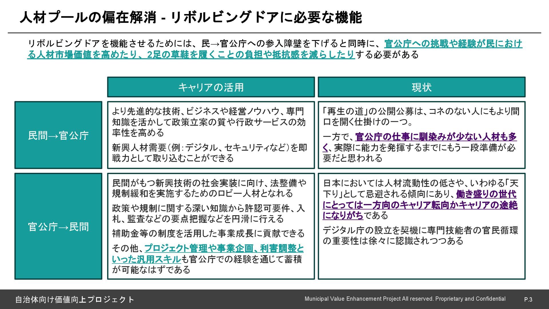 P.3 人材プールの偏在解消 - リボルビングドアに必要な機能 リボルビングドアを機能させるためには、民→官公庁への参入障壁を下げると同時に、官公庁への挑戦や経験が民におけ る人材市場価値を高めたり、2足の草鞋を履くことの負担や抵抗感を減らしたりする必要がある 民間→官公庁 官公庁→民間 より先進的な技術、ビジネスや経営ノウハウ、専門 知識を活かして政策立案の質や行政サービスの効 率性を高める 新興人材需要(例:デジタル、セキュリティなど)を即 戦力として取り込むことができる 民間がもつ新興技術の社会実装に向け、法整備や 規制緩和を実施するためのロビー人材となれる 政策や規制に関する深い知識から許認可要件、入 札、監査などの要点把握などを円滑に行える 補助金等の制度を活用した事業成長に貢献できる その他、プロジェクト管理や事業企画、利害調整と いった汎用スキルも官公庁での経験を通じて蓄積 が可能なはずである 「再生の道」の公開公募は、コネのない人にもより間 口を開く仕掛けの一つ。 一方で、官公庁の仕事に馴染みが少ない人材も多 く、実際に能力を発揮するまでにもう一段準備が必 要だと思われる 日本においては人材流動性の低さや、いわゆる「天 下り」として忌避される傾向にあり、働き盛りの世代 にとっては一方向のキャリア転向かキャリアの途絶 になりがちである デジタル庁の設立を契機に専門技能者の官民循環 の重要性は徐々に認識されつつある キャリアの活用 現状