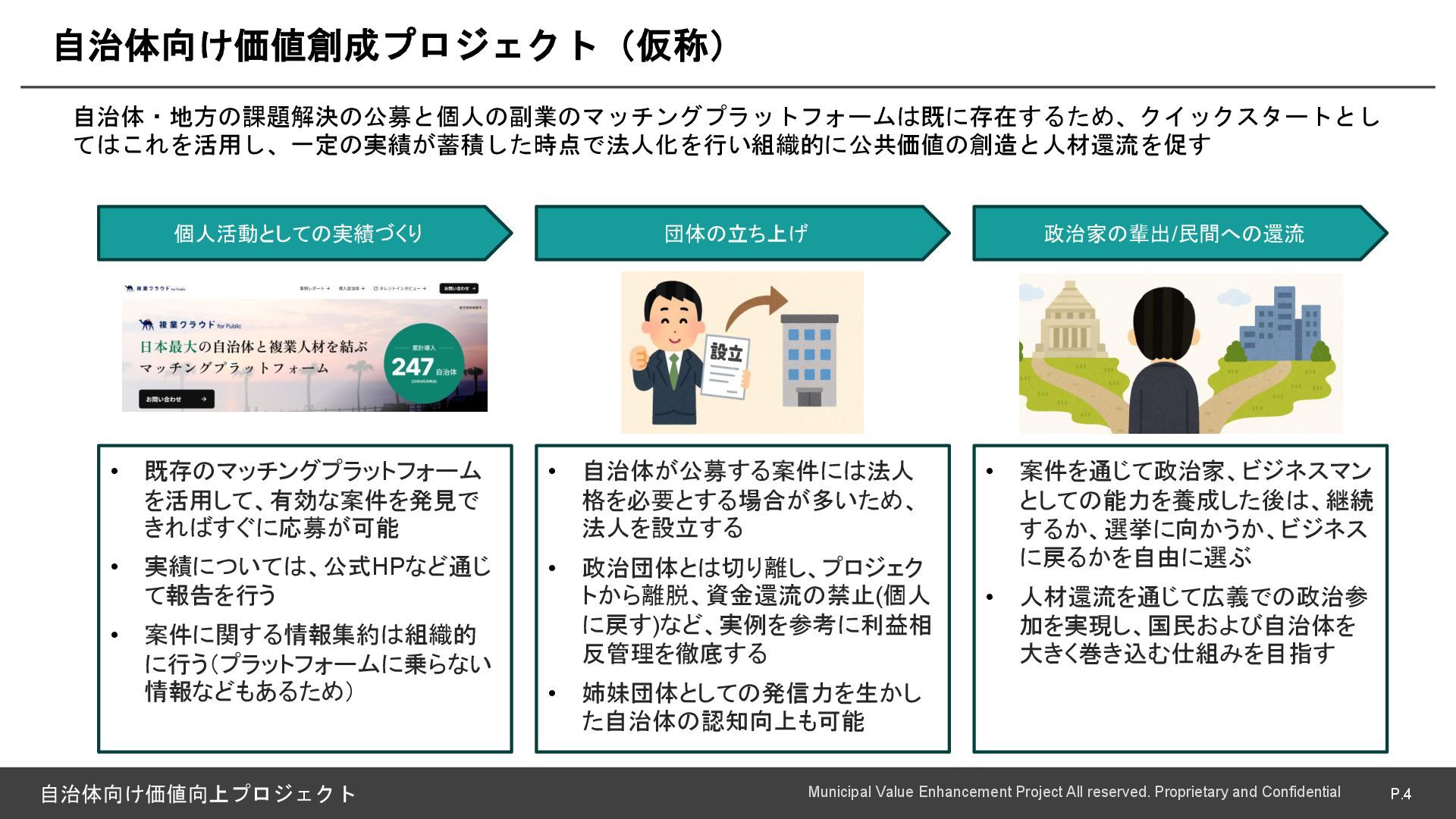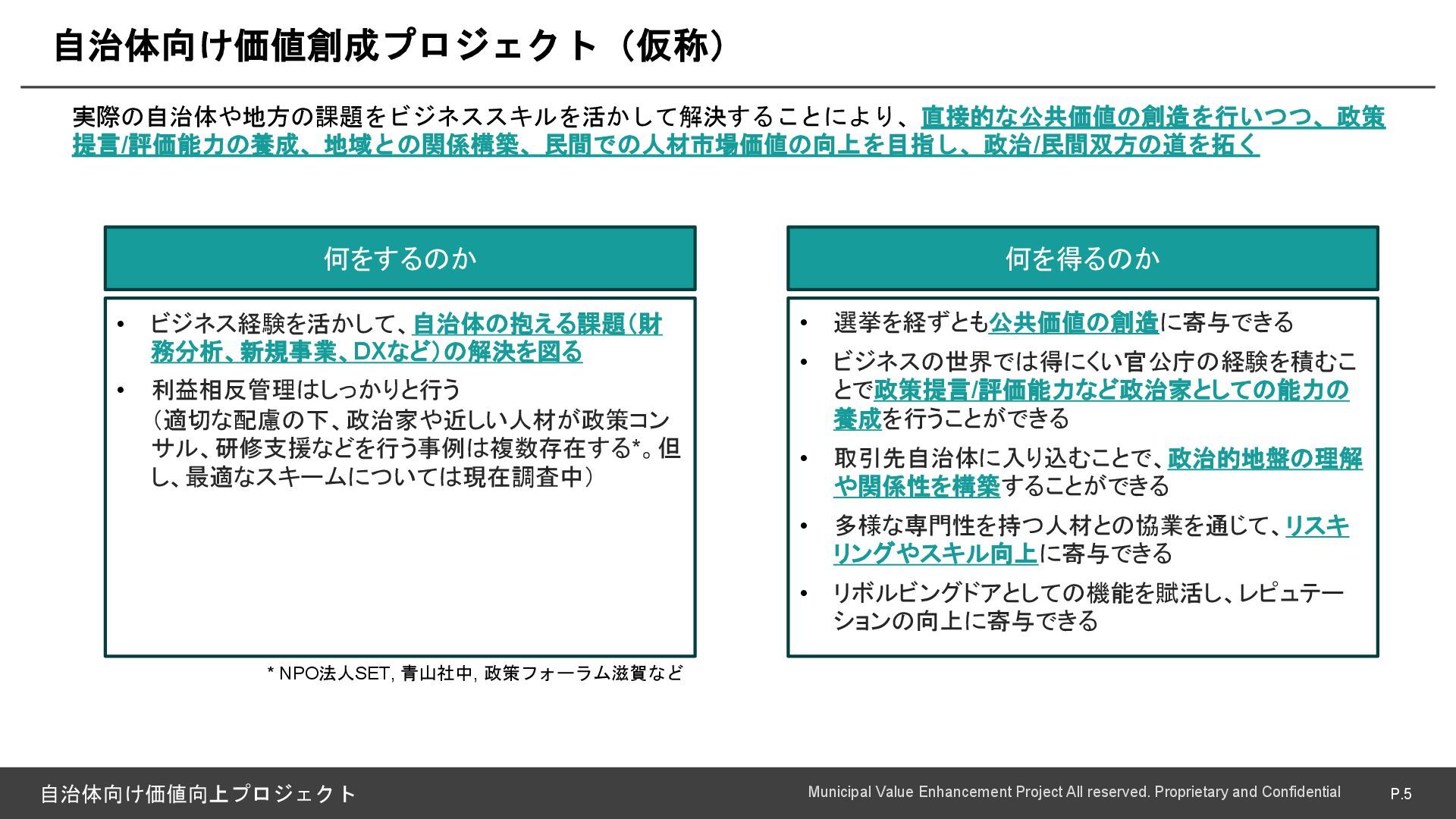 P.4 自治体向け価値創成プロジェクト(仮称) 自治体・地方の課題解決の公募と個人の副業のマッチングプラットフォームは既に存在するため、クイックスタートとし てはこれを活用し、一定の実績が蓄積した時点で法人化を行い組織的に公共価値の創造と人材還流を促す 個人活動としての実績づくり • 既存のマッチングプラットフォーム を活用して、有効な案件を発見で きればすぐに応募が可能 • 実績については、公式HPなど通じ て報告を行う • 案件に関する情報集約は組織的 に行う(プラットフォームに乗らない 情報などもあるため) 政治家の輩出/民間への還流 • 案件を通じて政治家、ビジネスマン としての能力を養成した後は、継続 するか、選挙に向かうか、ビジネス に戻るかを自由に選ぶ • 人材還流を通じて広義での政治参 加を実現し、国民および自治体を 大きく巻き込む仕組みを目指す 団体の立ち上げ • 自治体が公募する案件には法人 格を必要とする場合が多いため、 法人を設立する • 政治団体とは切り離し、プロジェク トから離脱、資金還流の禁止(個人 に戻す)など、実例を参考に利益相 反管理を徹底する • 姉妹団体としての発信力を生かし た自治体の認知向上も可能