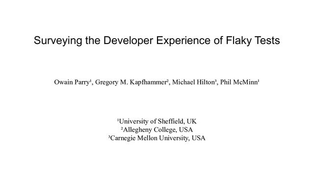 Slides for the talk of the paper "Surveying the Developer Experience of Flaky Tests", featured at the Software Engineering in Practice track of the 2022 International Conference of Software Engineering.
