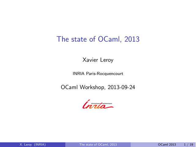 , release manager and general wizard. The core Caml development team: Alain Frisch, Jacques Garrigue, Benedikt Meurer, Fabrice Le Fessant, Gabriel Scherer, Hongbo Zhang, Jonathan Protzenko, Wojciech Meyer, Xavier Clerc, Xavier Leroy. With much appreciated contributions from: Anil Madhavapeddy, Benjamin Monate, Benoˆ ıt Vaugon, Chet Murthy, Christoph Bauer, Christophe Papazian, Christophe Troestler, Dan Bensen, Daniel B¨ unzli, David Allsopp, Fran¸ cois Berenger, Gabriel Kerneis, Gerd Stolpmann, Gr´ egoire Henry, Jacques-Henri Jourdan, Je↵rey Scofield, J´ er´ emie Dimino, J´ erˆ ome Vouillon, John Carr, Khoo Yit Phang, Leo P. White, Markus Mottl, Maxence Guesdon, Michel Mauny, Pierre Chambart, Pierre Weis, Tiphaine Turpin, Valentin Gatien-Baron, William Smith, ygrek. X. Leroy (INRIA) The state of OCaml, 2013 OCaml 2013 8 / 19