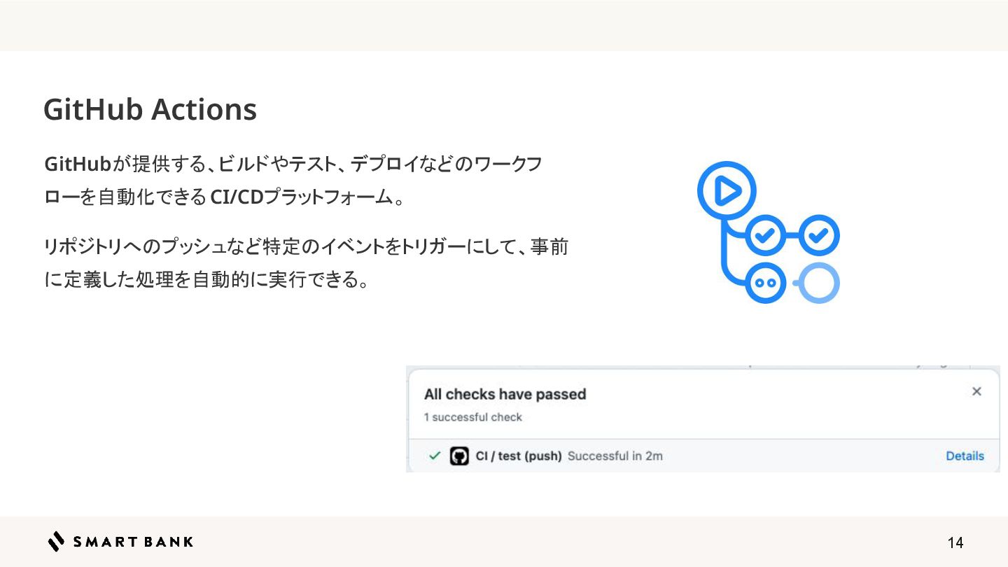 14 GitHub Actions GitHubが提供する、ビルドやテスト、デプロイなどのワークフ ローを自動化できる CI/CDプラットフォーム。 リポジトリへのプッシュなど特定のイベントをトリガーにして、事前 に定義した処理を自動的に実行できる。
