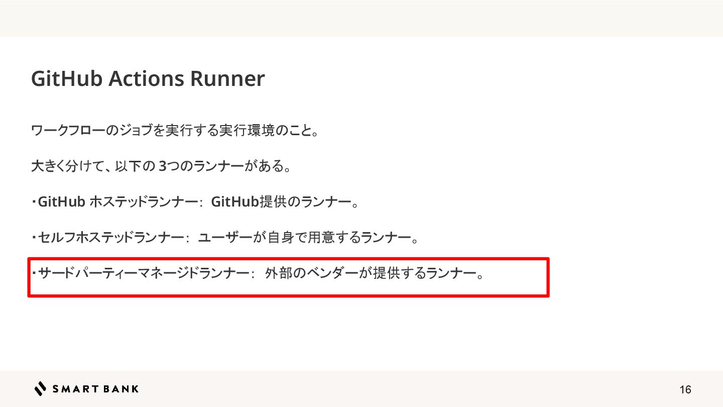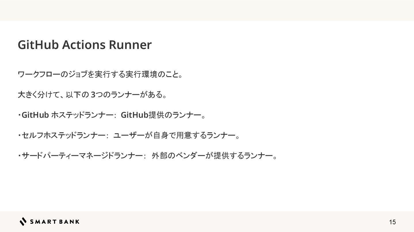 15 GitHub Actions Runner ワークフローのジョブを実行する実行環境のこと。 大きく分けて、以下の 3つのランナーがある。 ・GitHub
