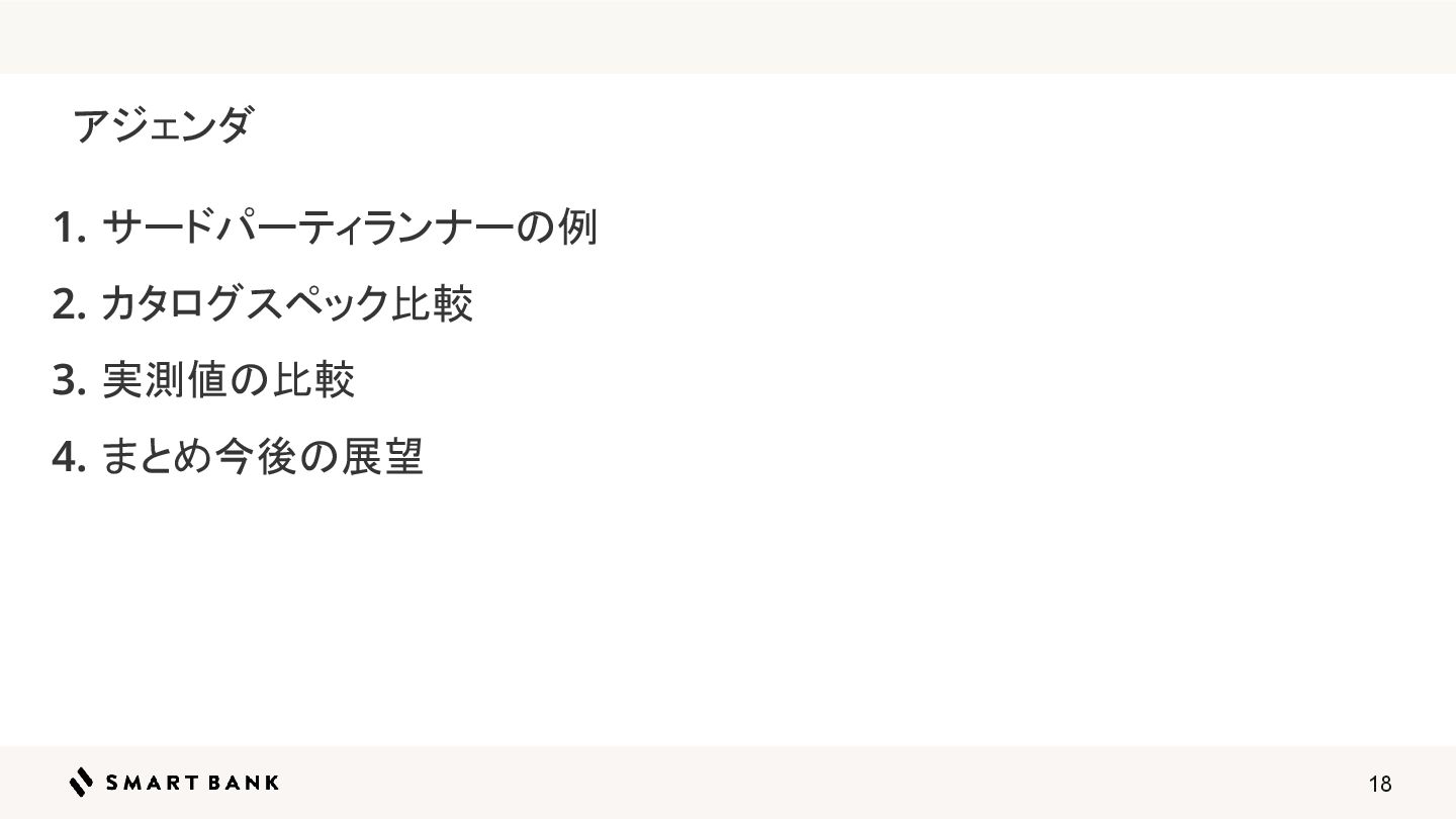 18 アジェンダ 1. サードパーティランナーの例 2. カタログスペック比較 3. 実測値の比較 4. まとめ今後の展望