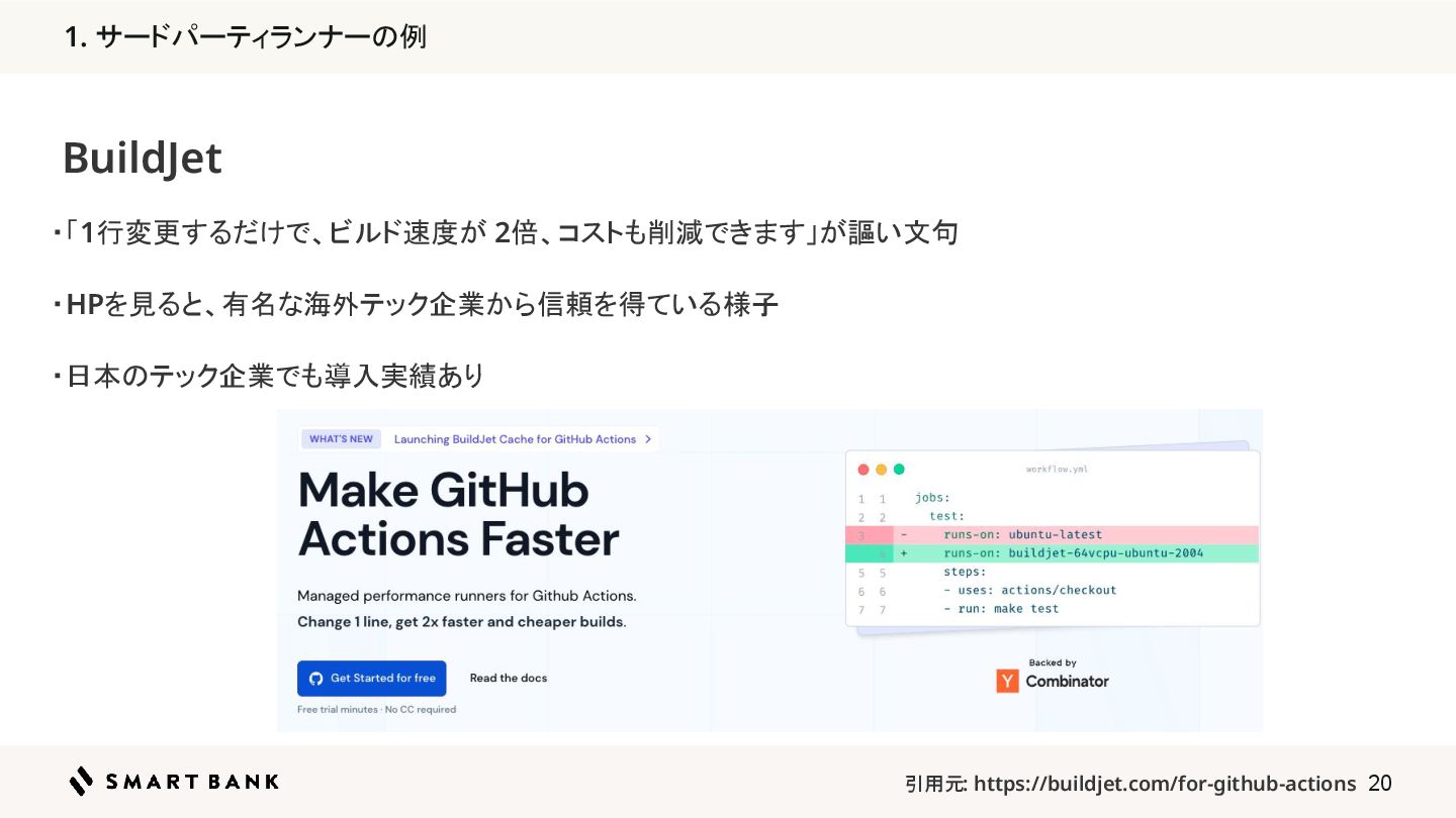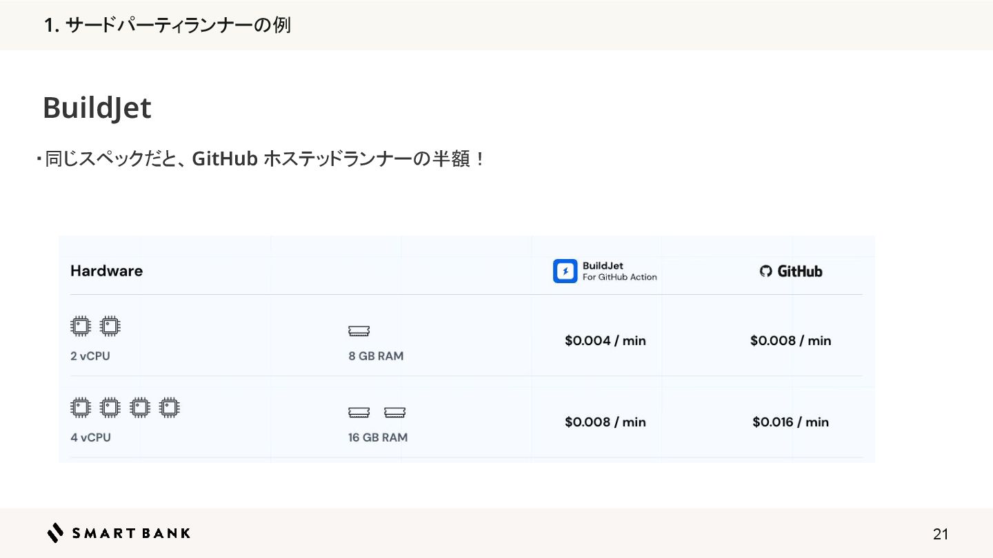 21 BuildJet ・同じスペックだと、GitHub ホステッドランナーの半額! 1. サードパーティランナーの例