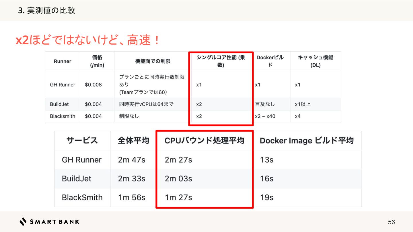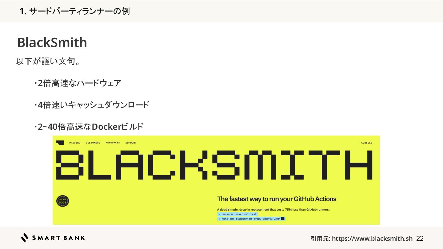 22 BlackSmith 以下が謳い文句。 ・2倍高速なハードウェア ・4倍速いキャッシュダウンロード ・2~40倍高速なDockerビルド 引用元: