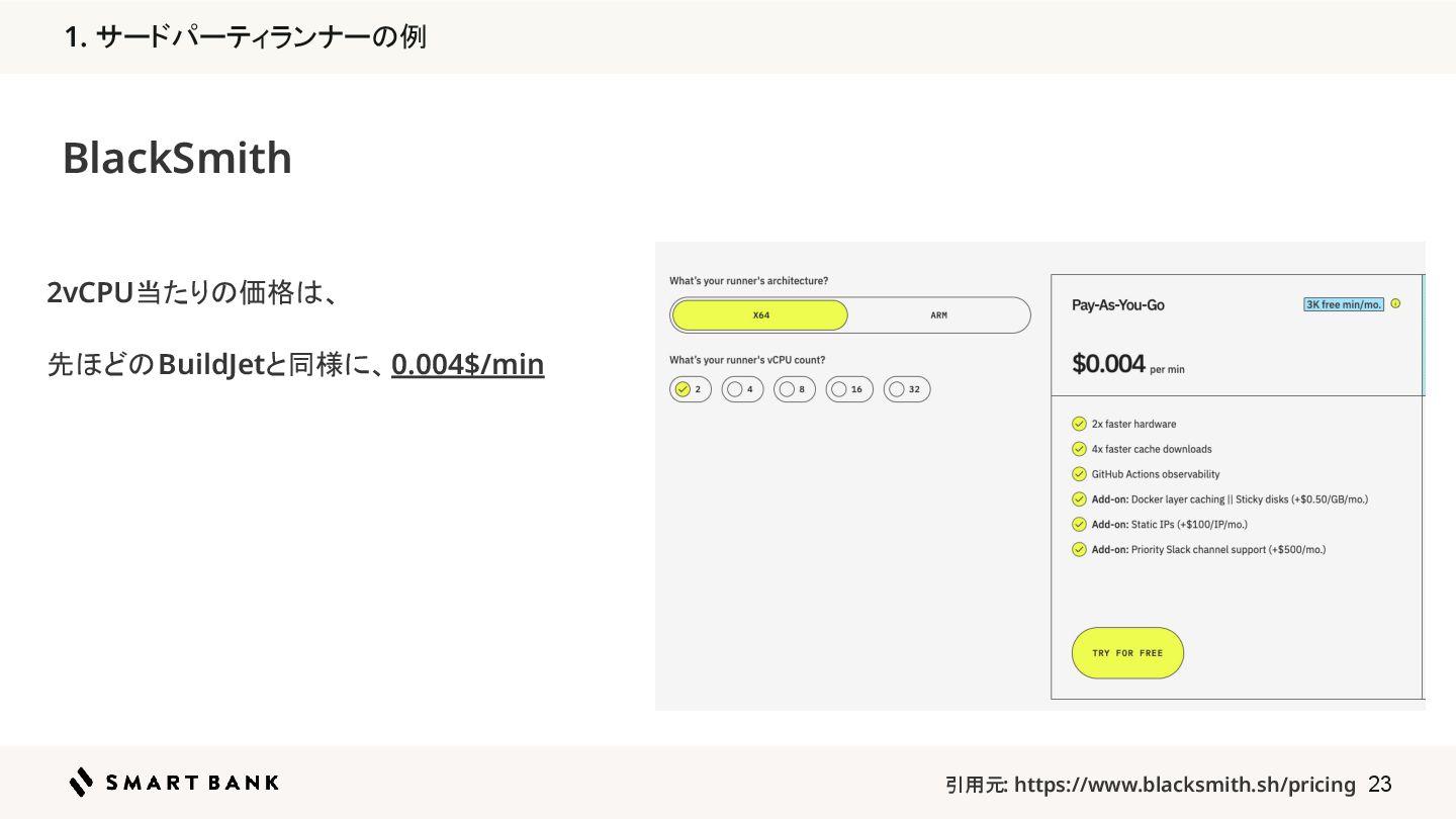 23 BlackSmith 2vCPU当たりの価格は、 先ほどのBuildJetと同様に、0.004$/min 引用元: https://www.blacksmith.sh/pricing 1. サードパーティランナーの例