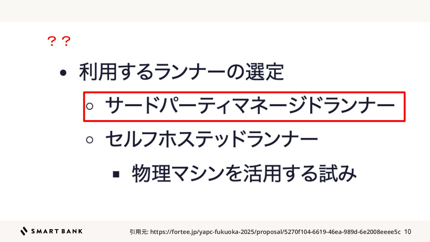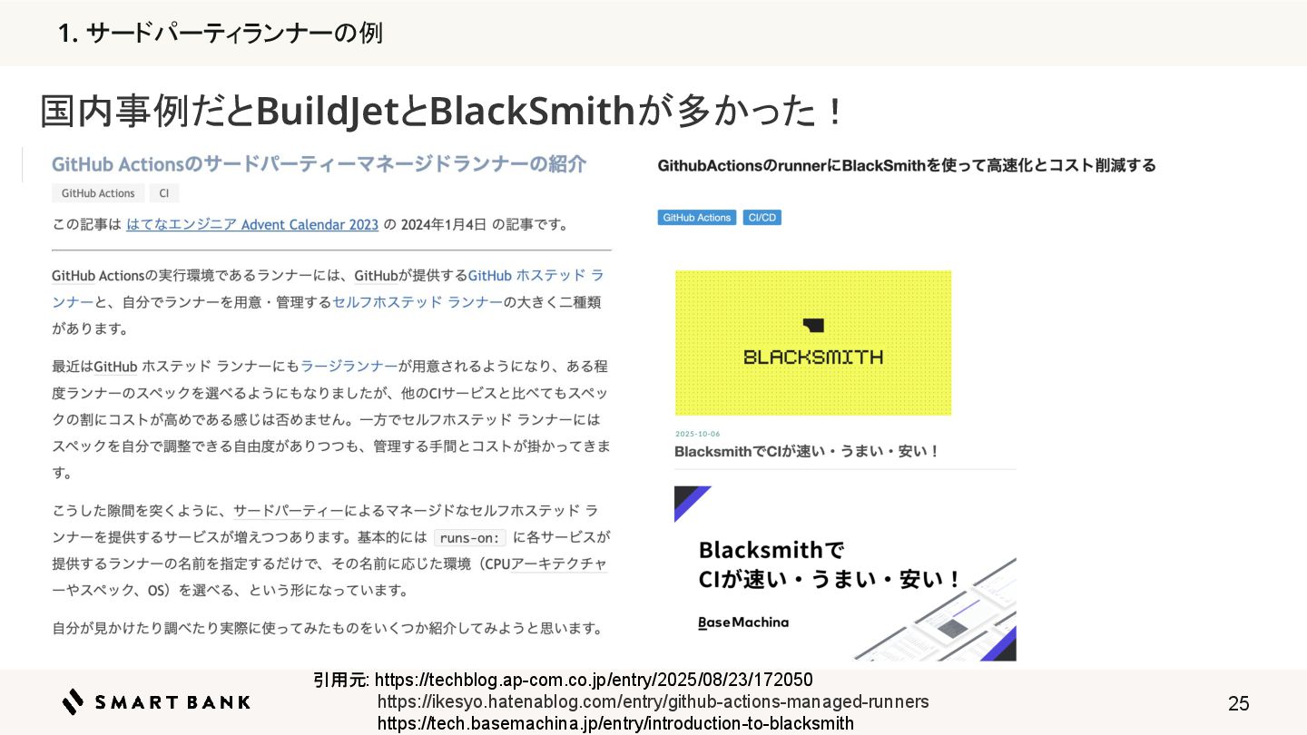 25 1. サードパーティランナーの例 国内事例だとBuildJetとBlackSmithが多かった! 引用元: https://techblog.ap-com.co.jp/entry/2025/08/23/172050 https://ikesyo.hatenablog.com/entry/github-actions-managed-runners https://tech.basemachina.jp/entry/introduction-to-blacksmith