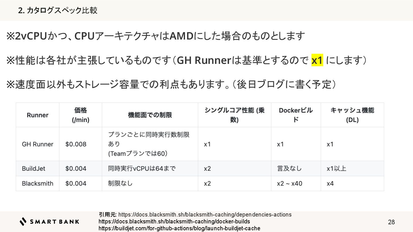 28 2. カタログスペック比較 ※2vCPUかつ、CPUアーキテクチャはAMDにした場合のものとします ※性能は各社が主張しているものです(GH Runnerは基準とするので x1 にします) ※速度面以外もストレージ容量での利点もあります。(後日ブログに書く予定)