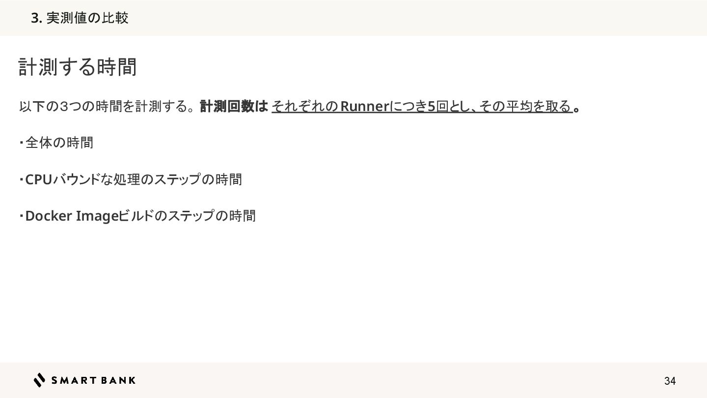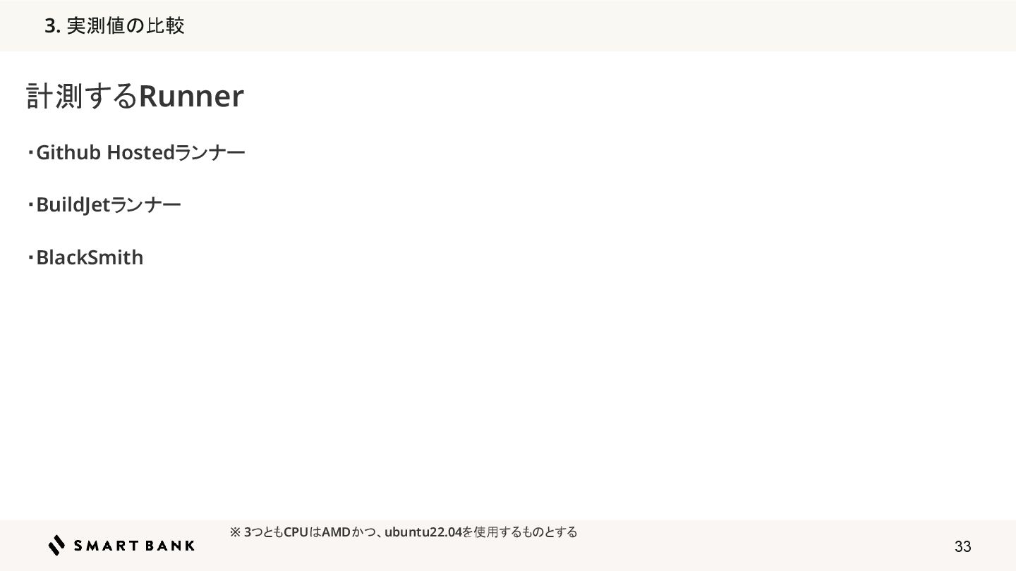 33 3. 実測値の比較 計測するRunner ・Github Hostedランナー ・BuildJetランナー ・BlackSmith