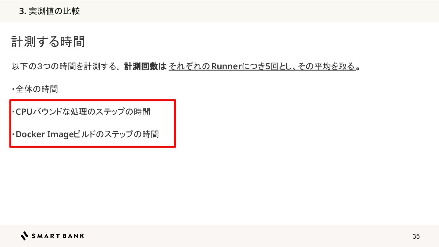 34 3. 実測値の比較 計測する時間 以下の3つの時間を計測する。 計測回数は それぞれのRunnerにつき5回とし、その平均を取る 。 ・全体の時間 ・CPUバウンドな処理のステップの時間