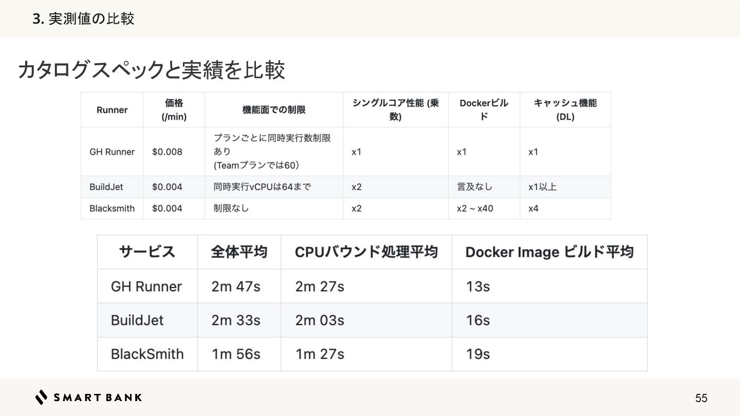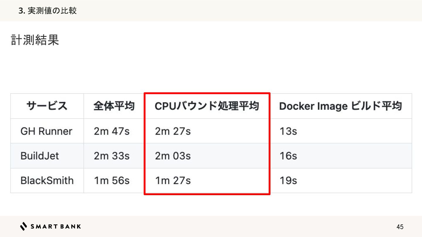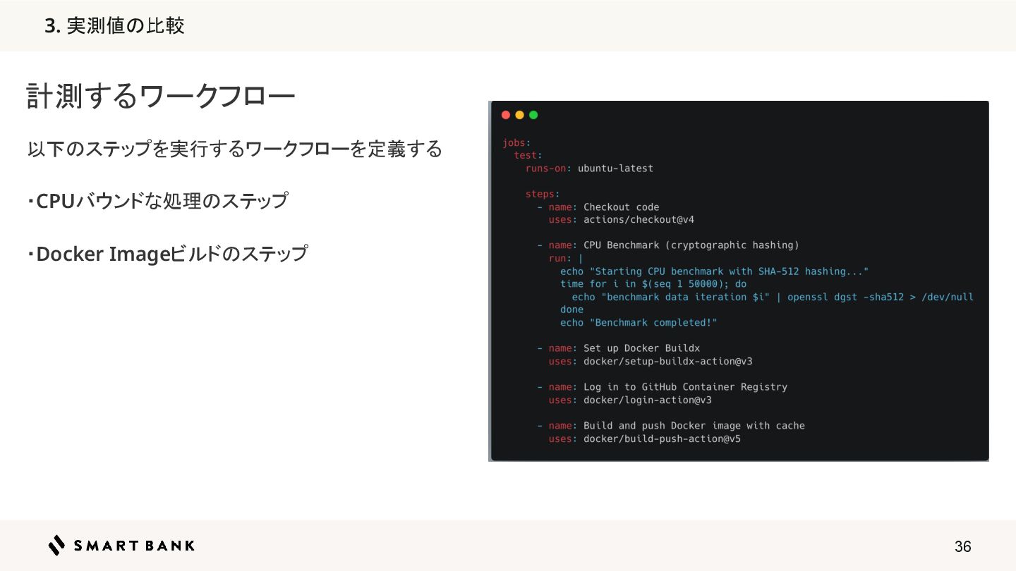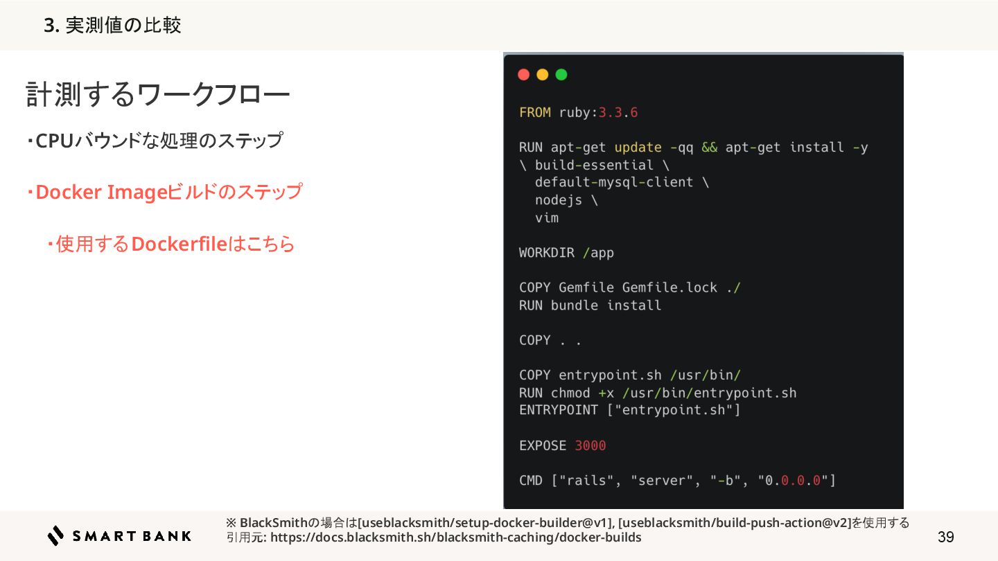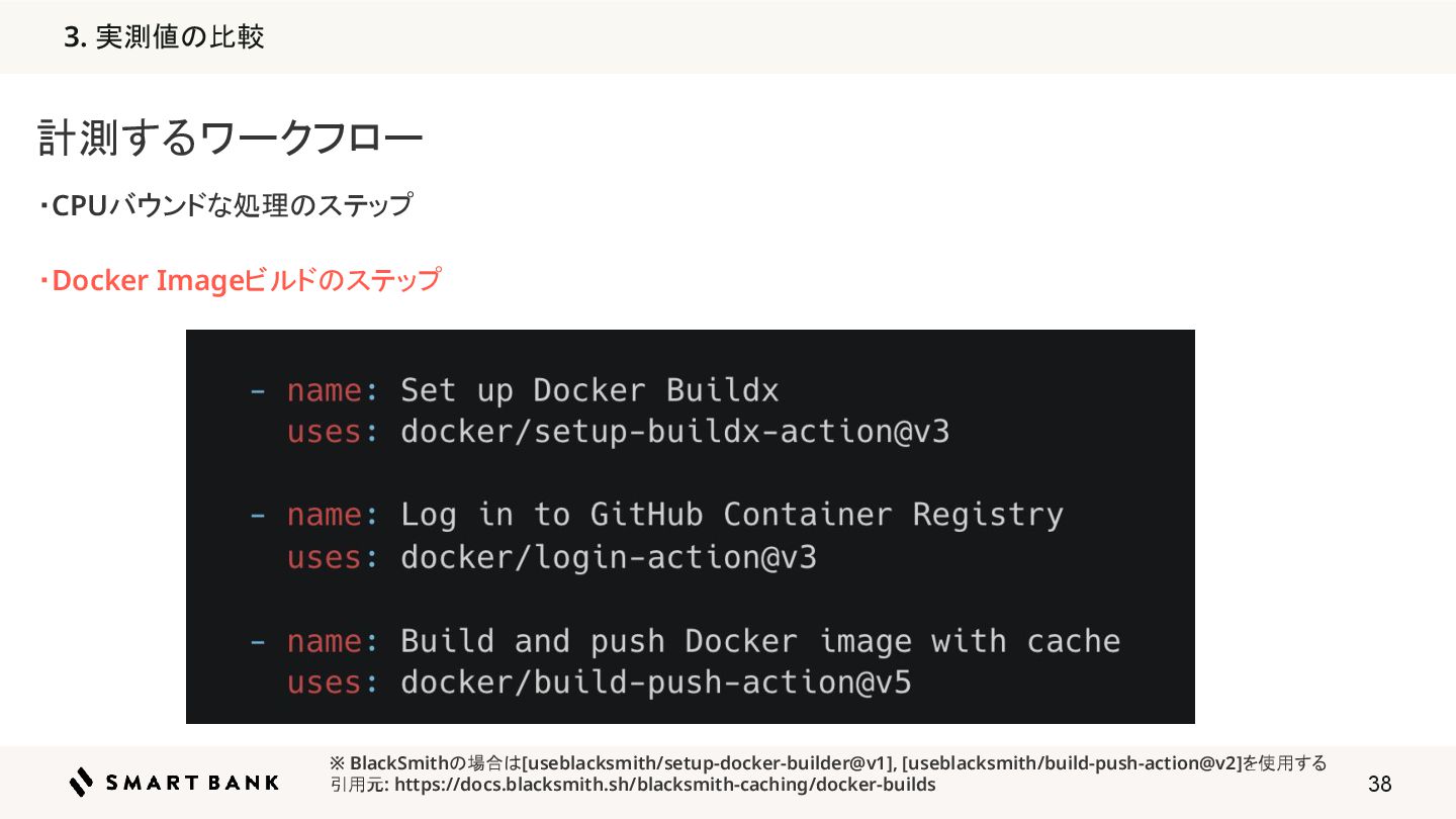 38 3. 実測値の比較 計測するワークフロー ・CPUバウンドな処理のステップ ・Docker Imageビルドのステップ ※ BlackSmithの場合は[useblacksmith/setup-docker-builder@v1],
