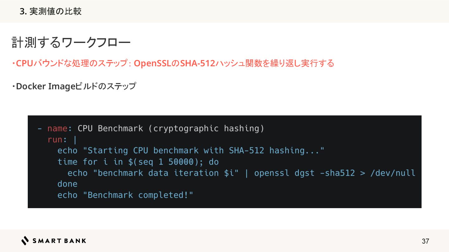 37 3. 実測値の比較 計測するワークフロー ・CPUバウンドな処理のステップ: OpenSSLのSHA-512ハッシュ関数を繰り返し実行する ・Docker Imageビルドのステップ