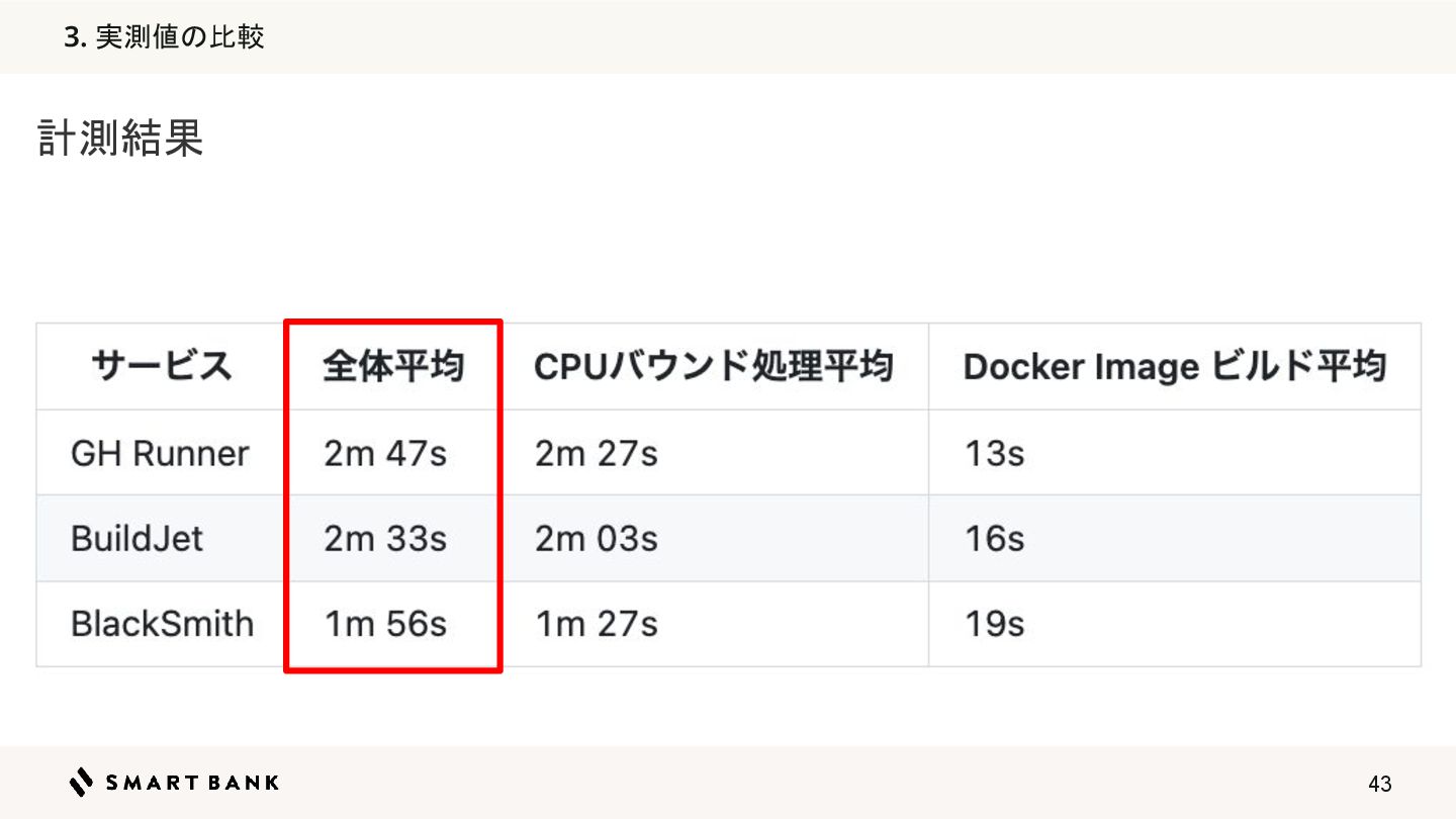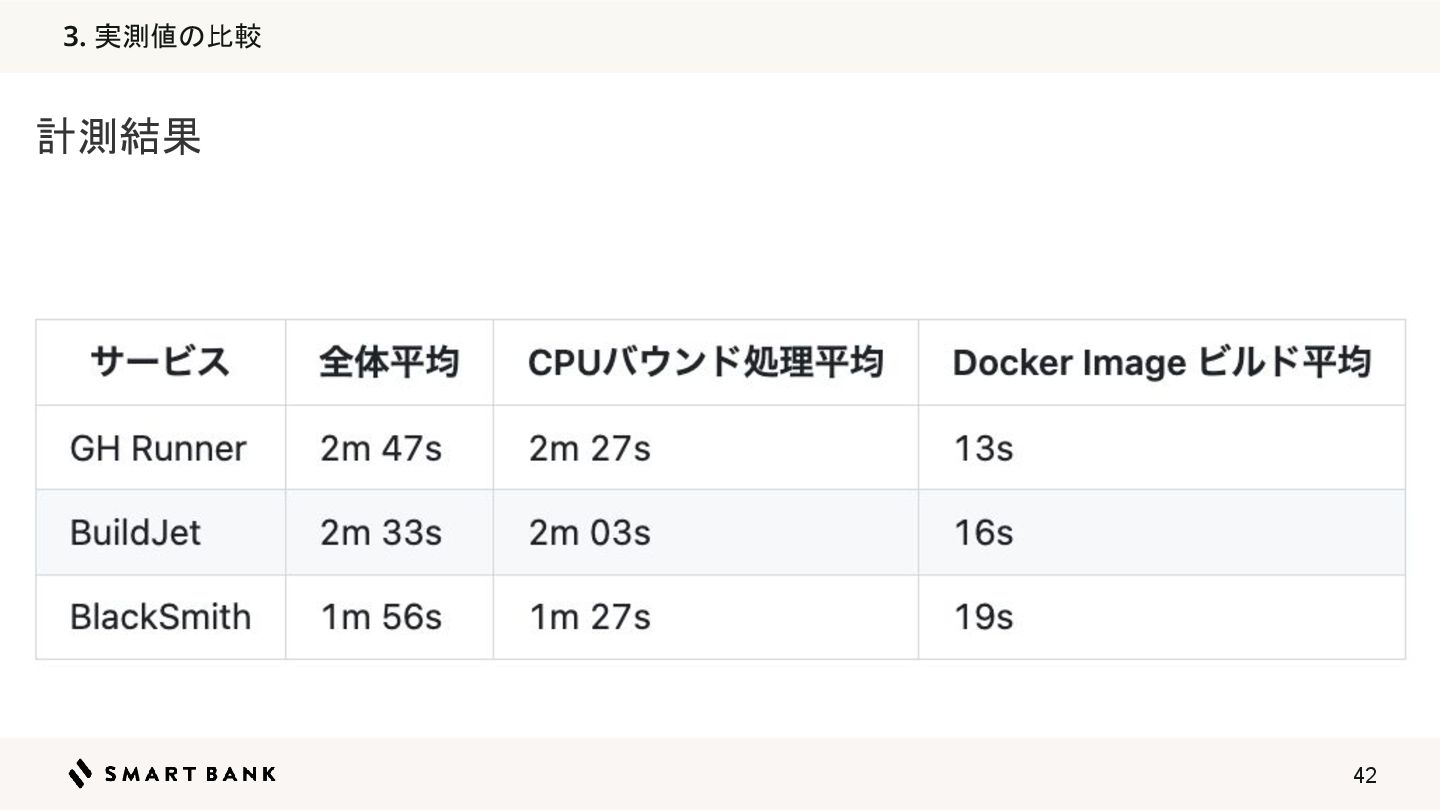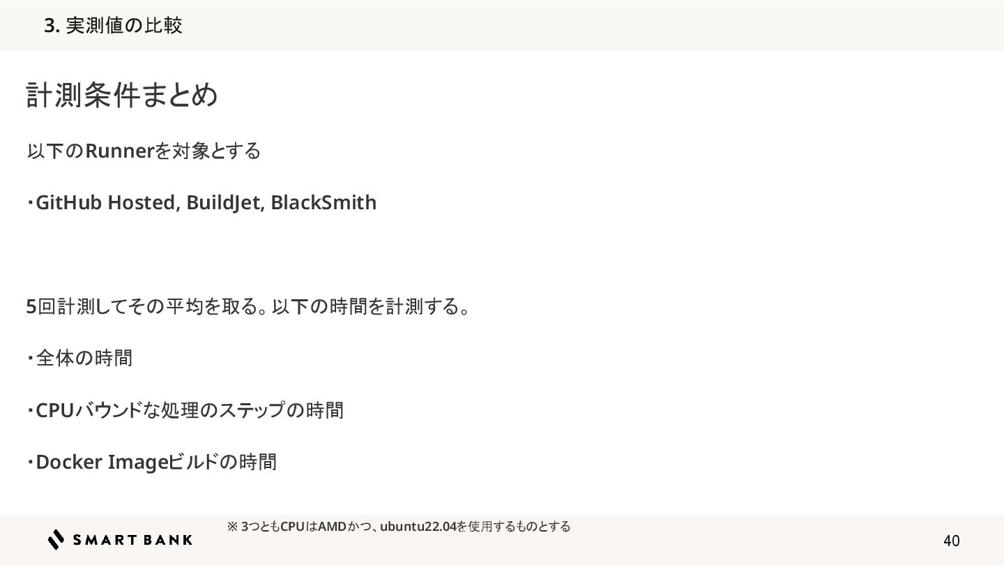 40 3. 実測値の比較 計測条件まとめ 以下のRunnerを対象とする ・GitHub Hosted, BuildJet, BlackSmith