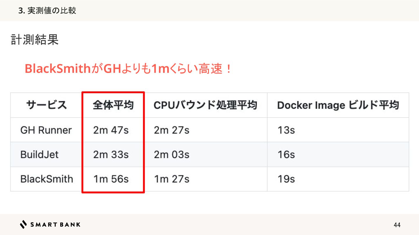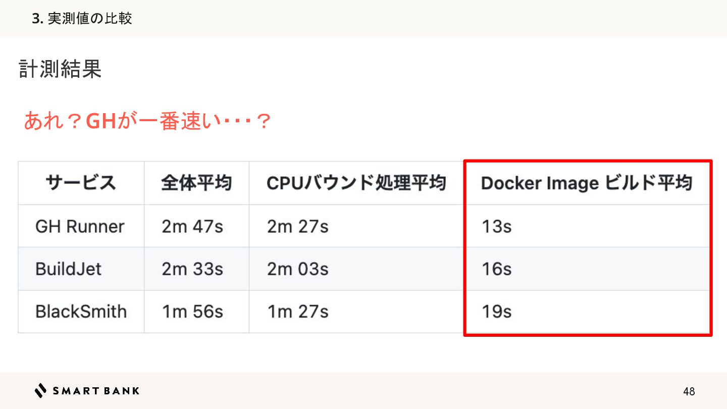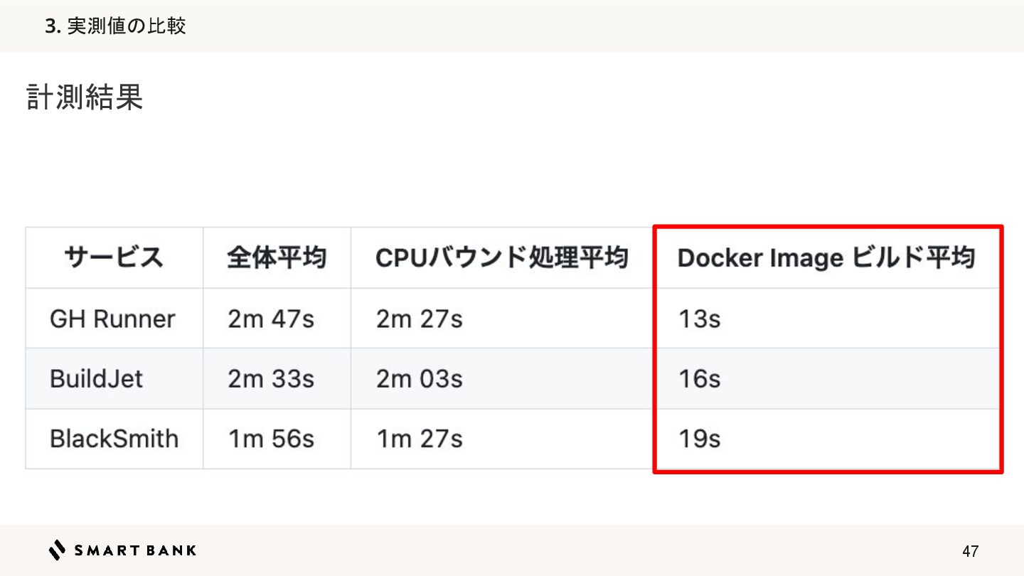 46 3. 実測値の比較 計測結果 こちらもBlackSmithがGHよりも1mくらい高速! BuildJetも30sくらい高速!