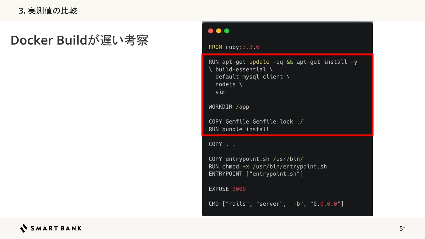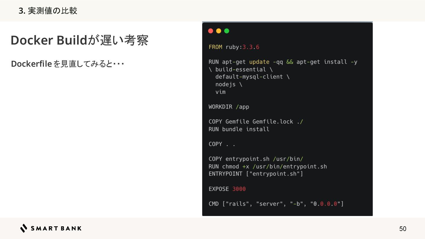 50 3. 実測値の比較 Docker Buildが遅い考察 Dockerfile を見直してみると・・・