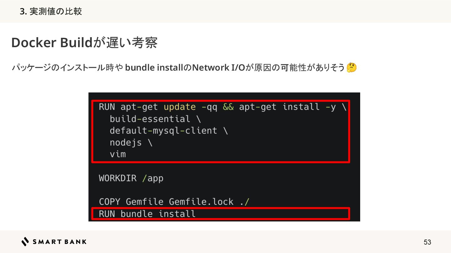 53 3. 実測値の比較 Docker Buildが遅い考察 パッケージのインストール時や bundle installのNetwork I/Oが原因の可能性がありそう 🤔