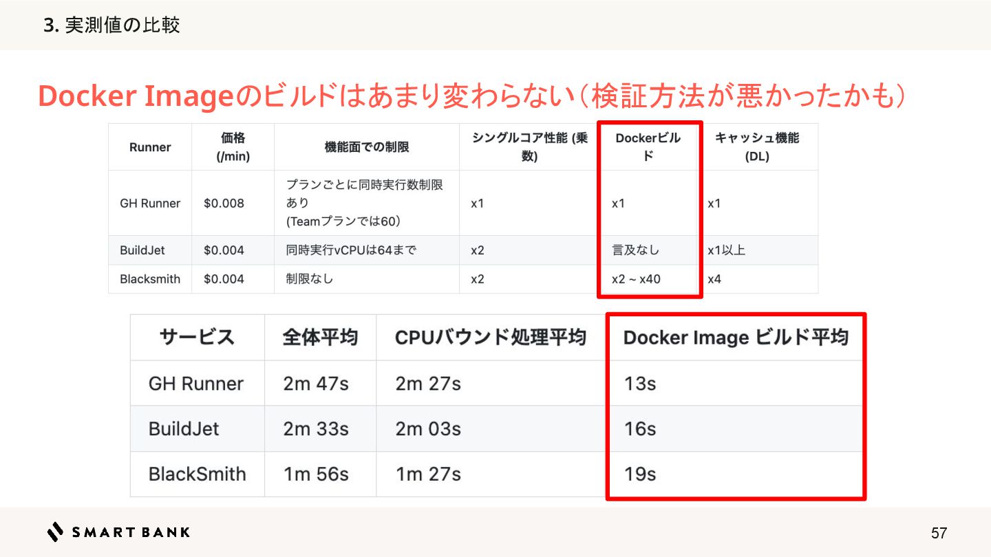 57 3. 実測値の比較 Docker Imageのビルドはあまり変わらない(検証方法が悪かったかも)