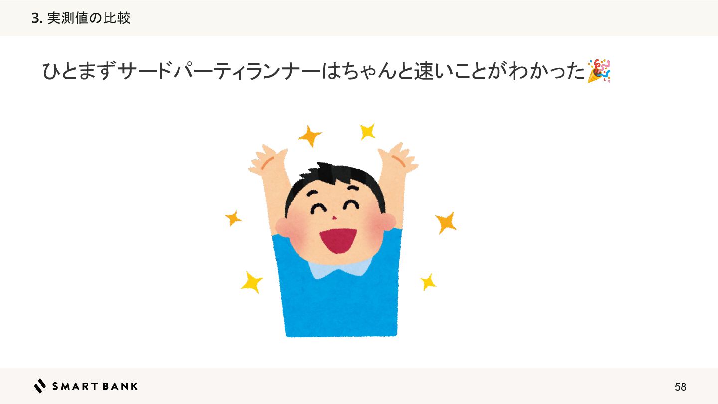 58 3. 実測値の比較 ひとまずサードパーティランナーはちゃんと速いことがわかった🎉