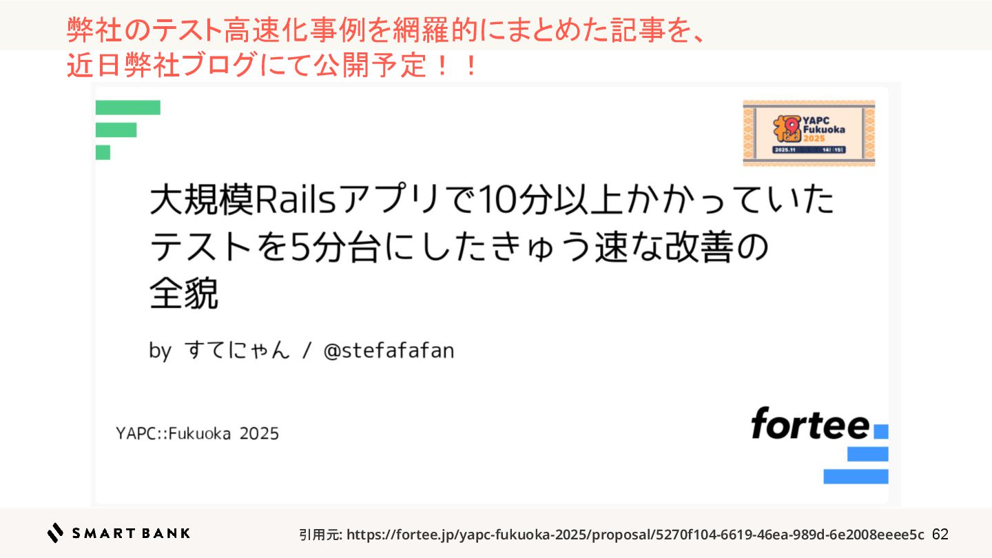 62 引用元: https://fortee.jp/yapc-fukuoka-2025/proposal/5270f104-6619-46ea-989d-6e2008eeee5c 弊社のテスト高速化事例を網羅的にまとめた記事を、 近日弊社ブログにて公開予定!!