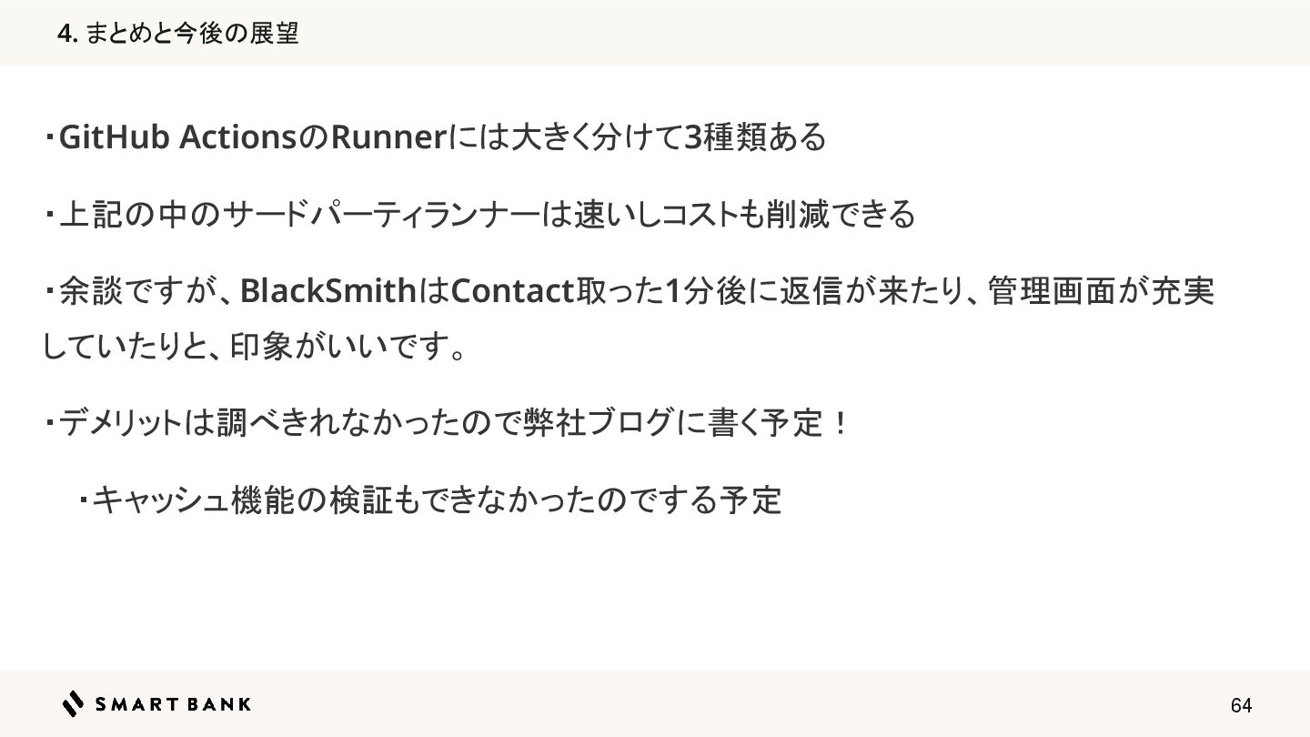 64 4. まとめと今後の展望 ・GitHub ActionsのRunnerには大きく分けて3種類ある ・上記の中のサードパーティランナーは速いしコストも削減できる ・余談ですが、BlackSmithはContact取った1分後に返信が来たり、管理画面が充実 していたりと、印象がいいです。 ・デメリットは調べきれなかったので弊社ブログに書く予定!