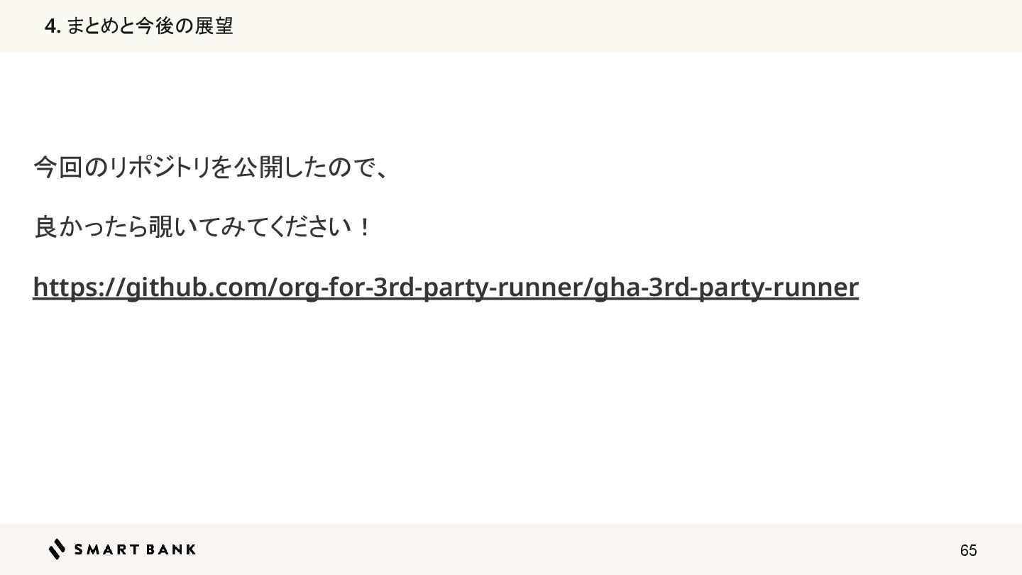 65 4. まとめと今後の展望 今回のリポジトリを公開したので、 良かったら覗いてみてください! https://github.com/org-for-3rd-party-runner/gha-3rd-party-runner