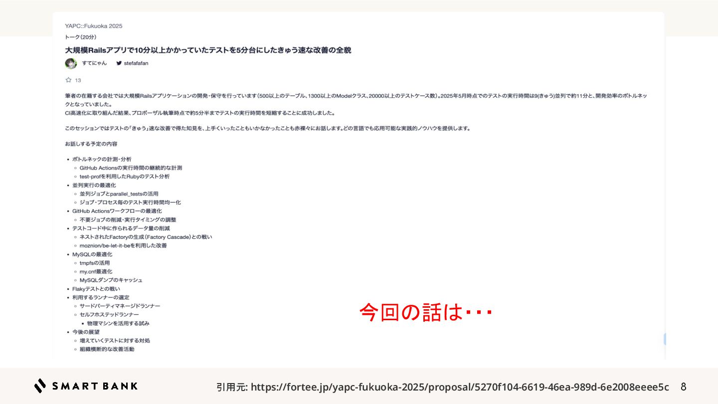 8 引用元: https://fortee.jp/yapc-fukuoka-2025/proposal/5270f104-6619-46ea-989d-6e2008eeee5c 今回の話は・・・
