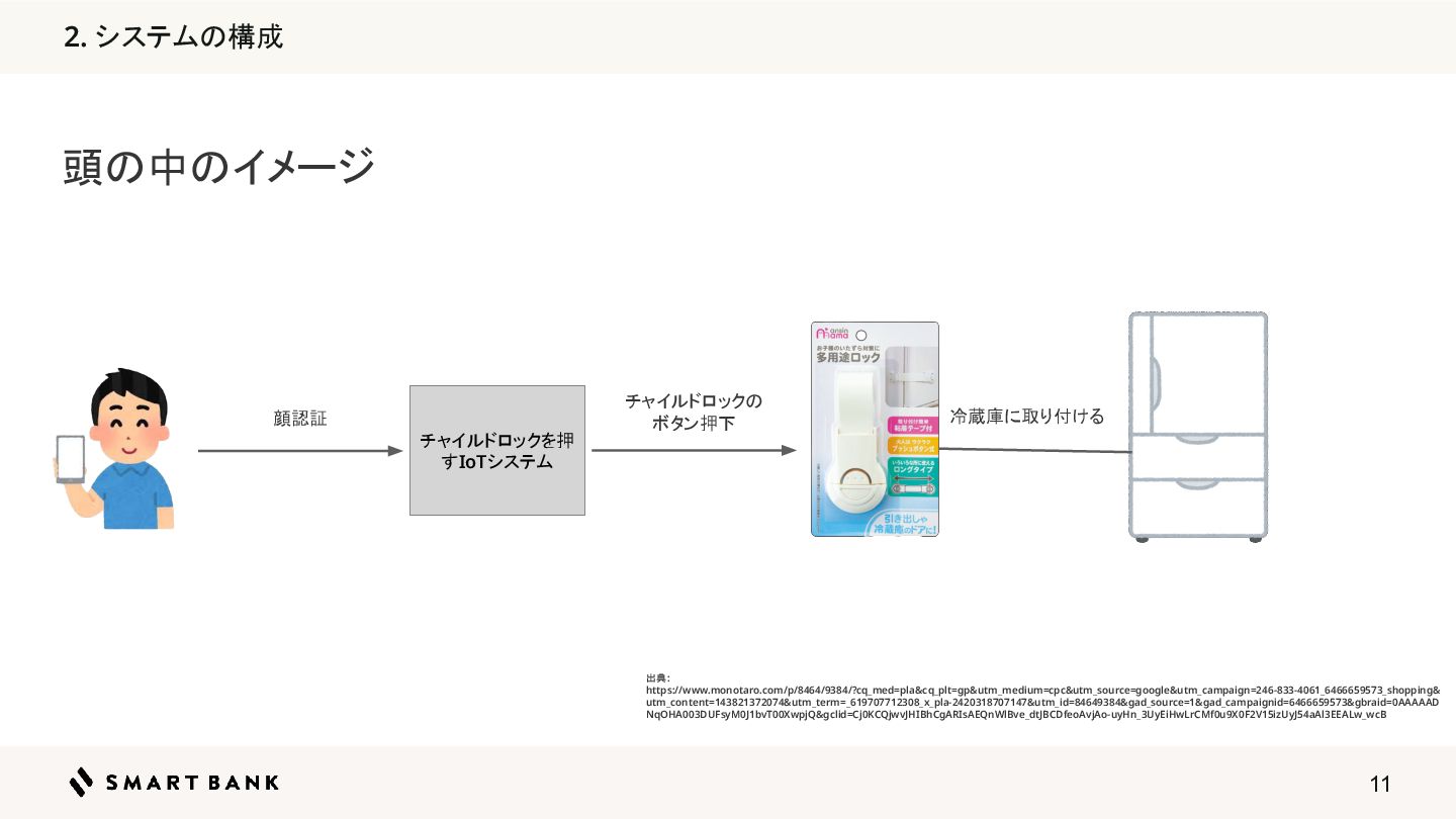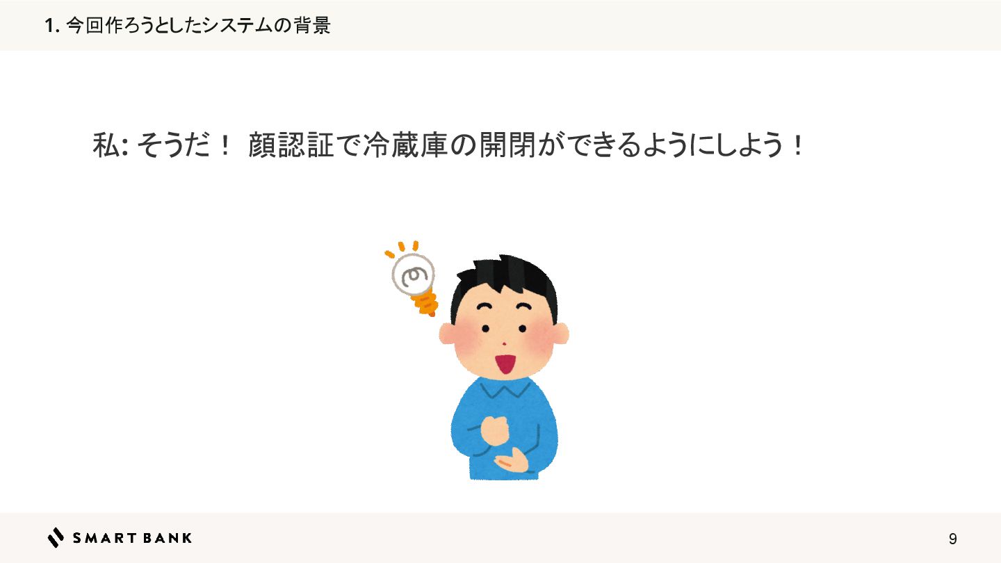 9 1. 今回作ろうとしたシステムの背景 私: そうだ! 顔認証で冷蔵庫の開閉ができるようにしよう!