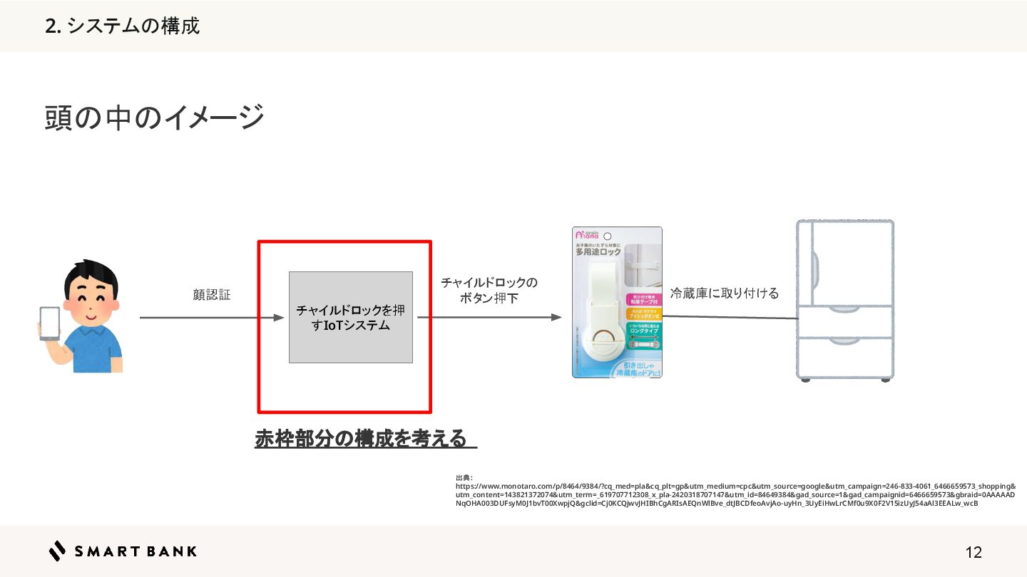 11 2. システムの構成 頭の中のイメージ 顔認証 出典: https://www.monotaro.com/p/8464/9384/?cq_med=pla&cq_plt=gp&utm_medium=cpc&utm_source=google&utm_campaign=246-833-4061_6466659573_shopping& utm_content=143821372074&utm_term=_619707712308_x_pla-2420318707147&utm_id=84649384&gad_source=1&gad_campaignid=6466659573&gbraid=0AAAAAD NqOHA003DUFsyM0J1bvT00XwpjQ&gclid=Cj0KCQjwvJHIBhCgARIsAEQnWlBve_dtJBCDfeoAvjAo-uyHn_3UyEiHwLrCMf0u9X0F2V15izUyJ54aAl3EEALw_wcB チャイルドロックを押