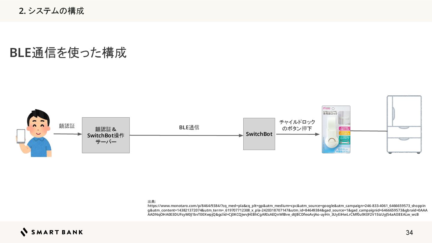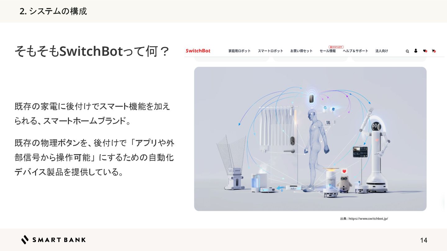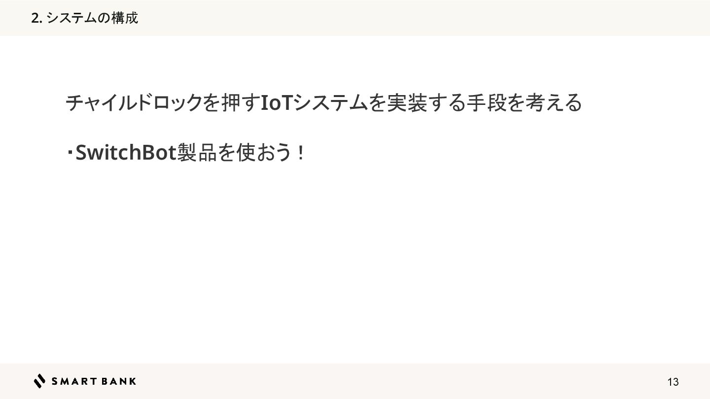 13 2. システムの構成 チャイルドロックを押すIoTシステムを実装する手段を考える ・SwitchBot製品を使おう!