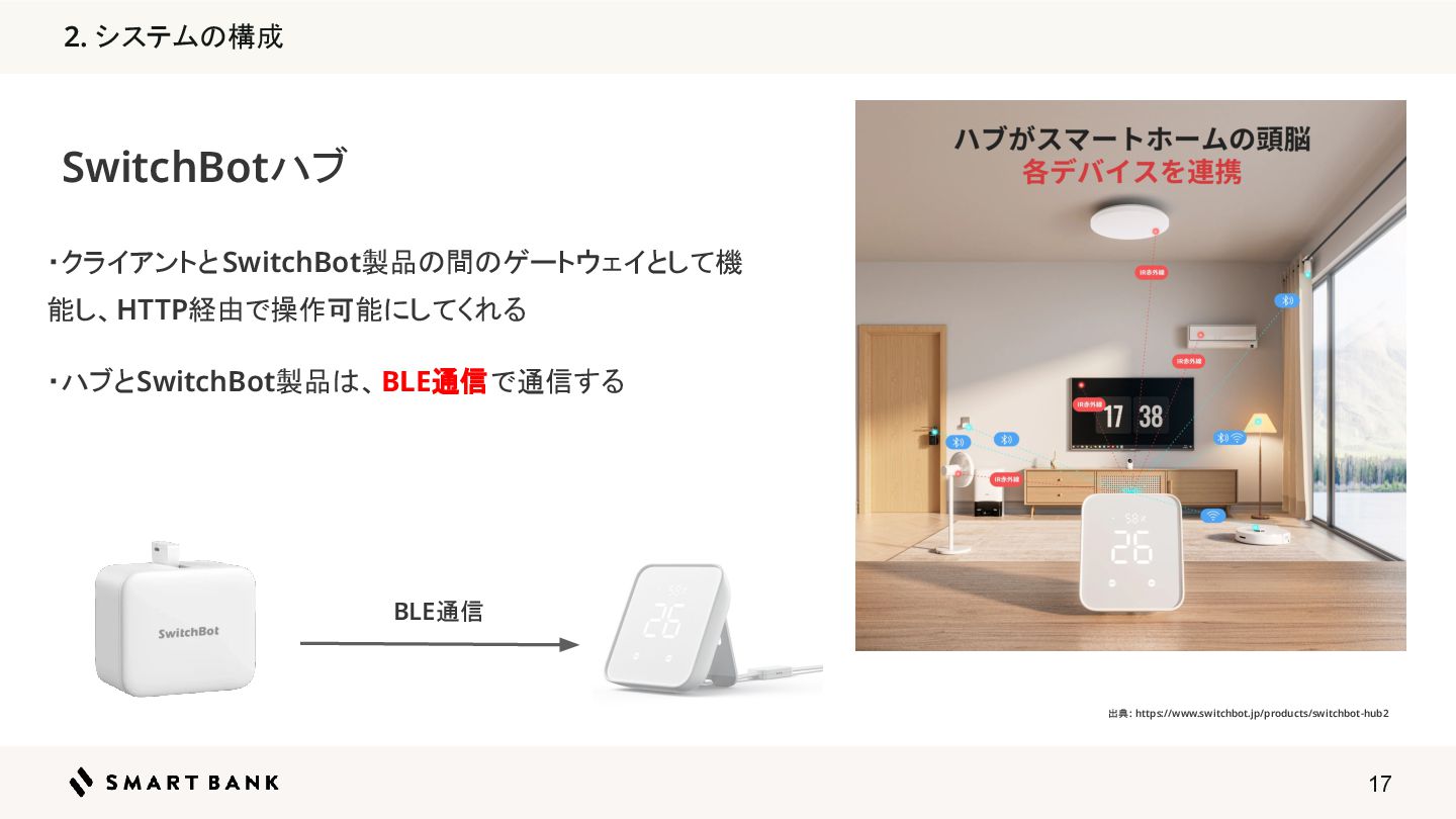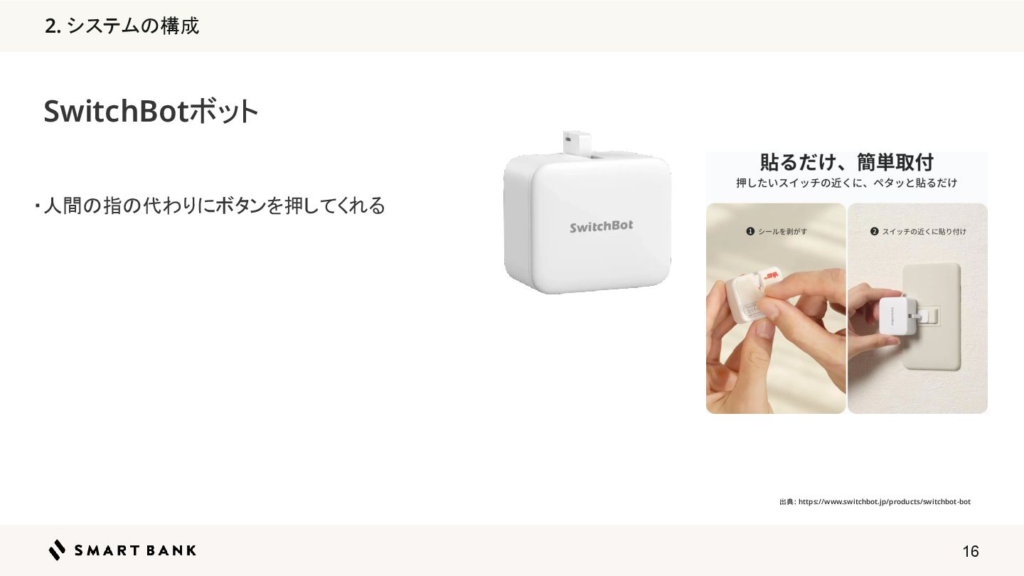 出典: https://www.switchbot.jp/products/switchbot-bot 16 2. システムの構成 SwitchBotボット ・人間の指の代わりにボタンを押してくれる