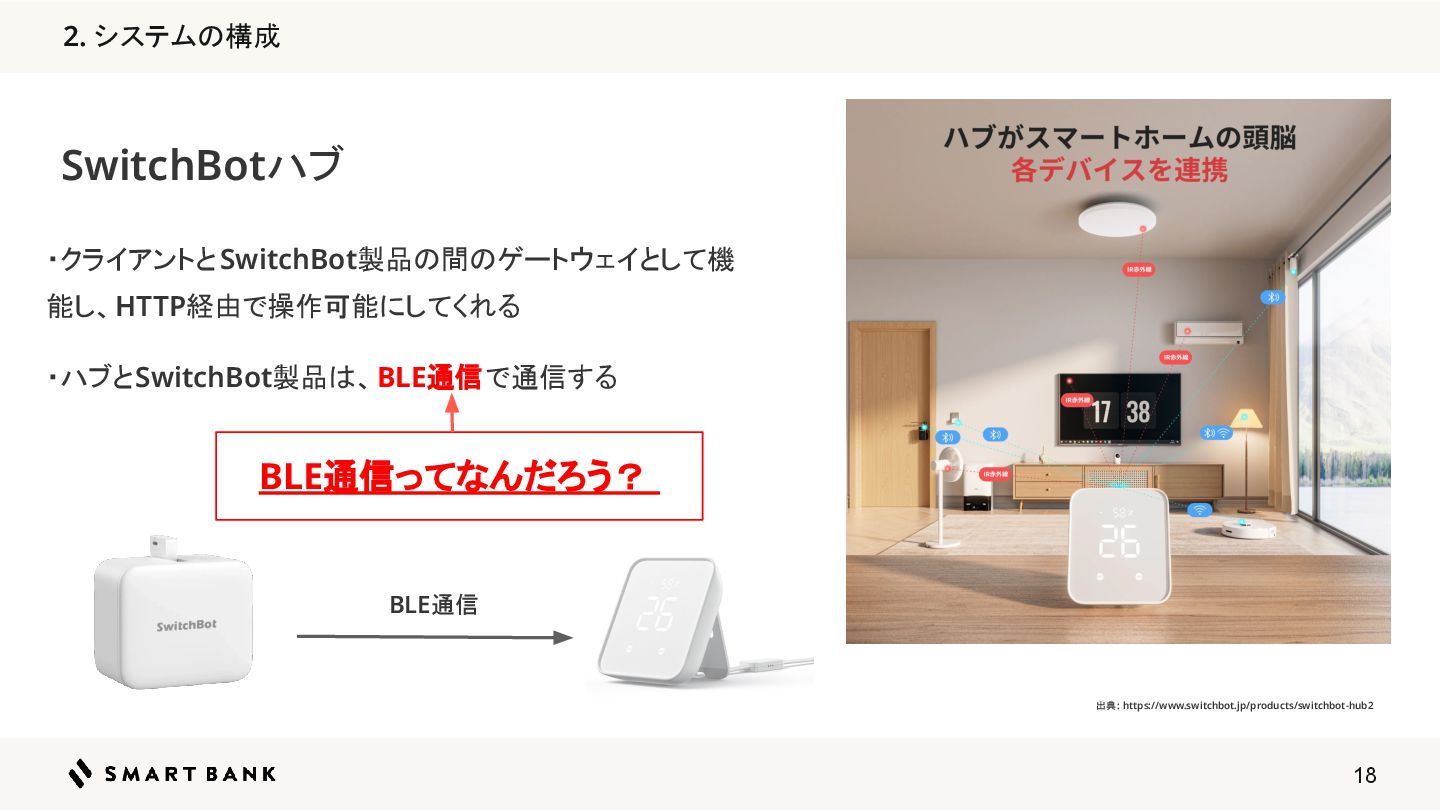 出典: https://www.switchbot.jp/products/switchbot-hub2 17 2. システムの構成 SwitchBotハブ ・クライアントとSwitchBot製品の間のゲートウェイとして機 能し、HTTP経由で操作可能にしてくれる ・ハブとSwitchBot製品は、BLE通信で通信する