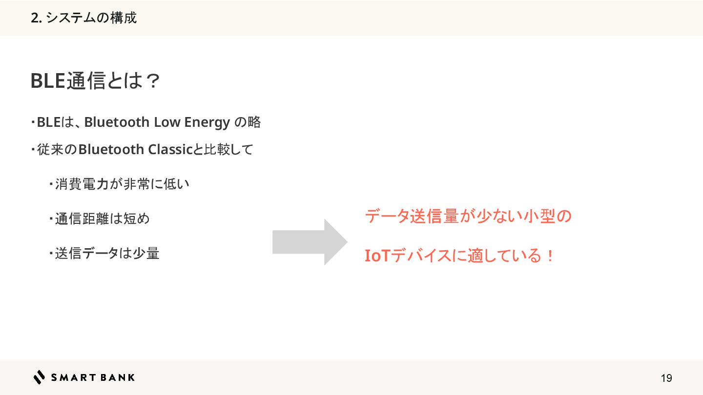 19 2. システムの構成 BLE通信とは? ・BLEは、Bluetooth Low Energy の略 データ送信量が少ない小型の IoTデバイスに適している!