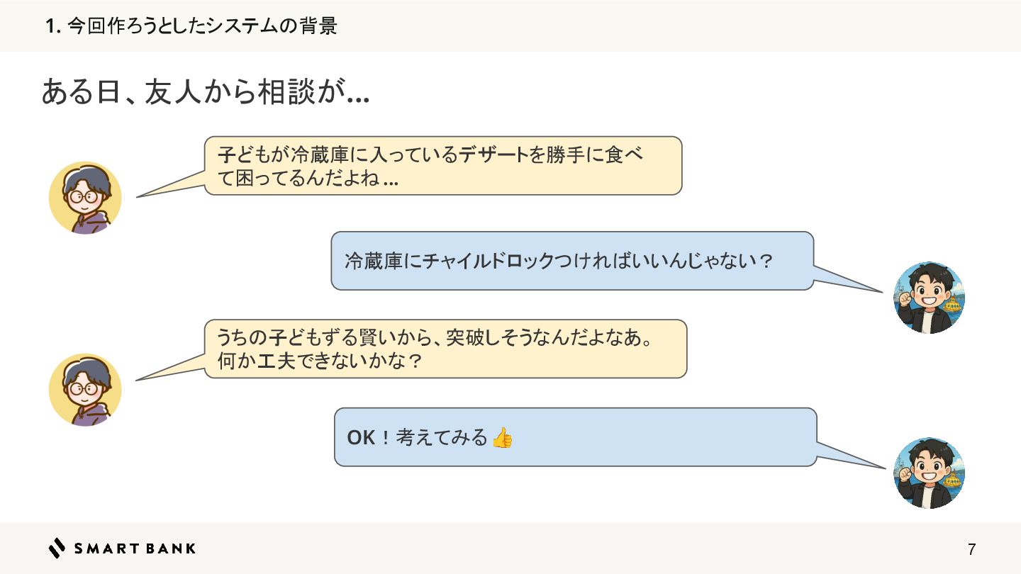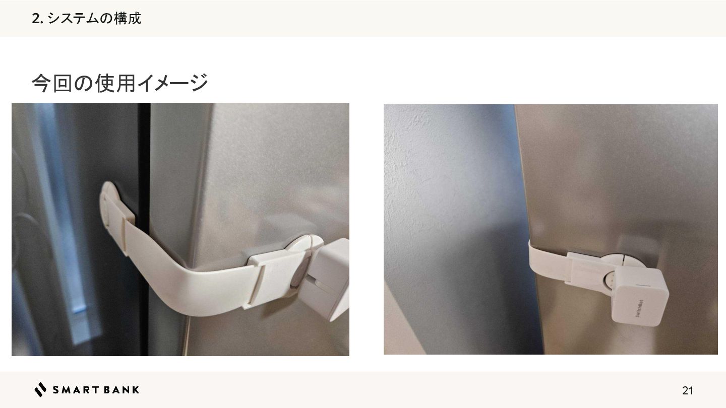 7 1. 今回作ろうとしたシステムの背景 子どもが冷蔵庫に入っているデザートを勝手に食べ て困ってるんだよね … 冷蔵庫にチャイルドロックつければいいんじゃない? うちの子どもずる賢いから、突破しそうなんだよなあ。