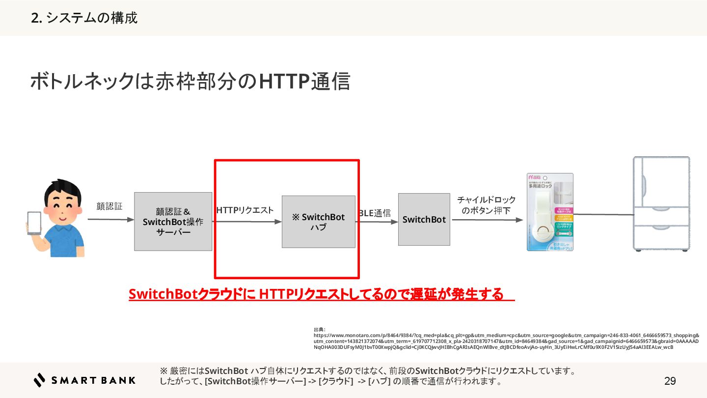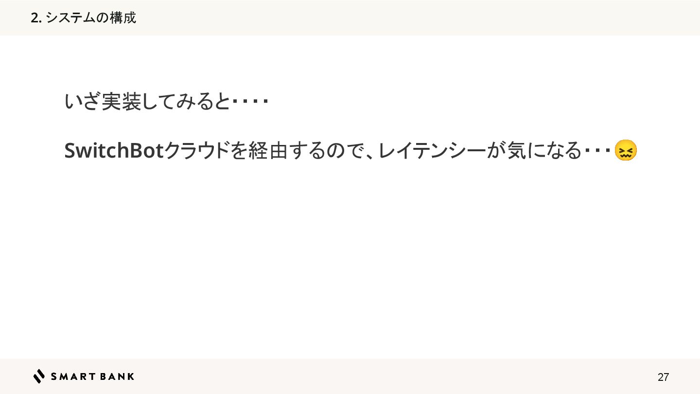 27 2. システムの構成 いざ実装してみると・・・・ SwitchBotクラウドを経由するので、レイテンシーが気になる・・・😖