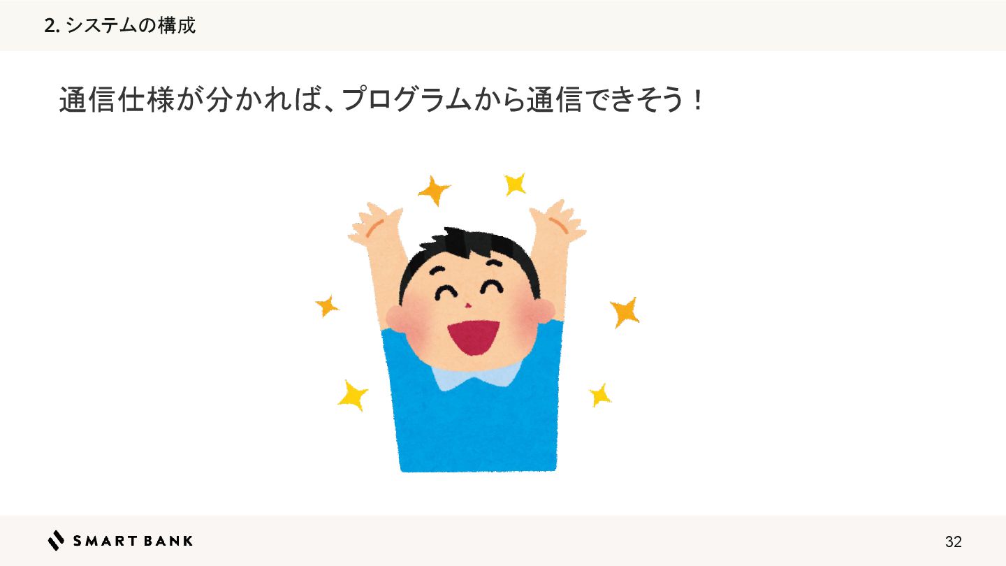 32 2. システムの構成 通信仕様が分かれば、プログラムから通信できそう!