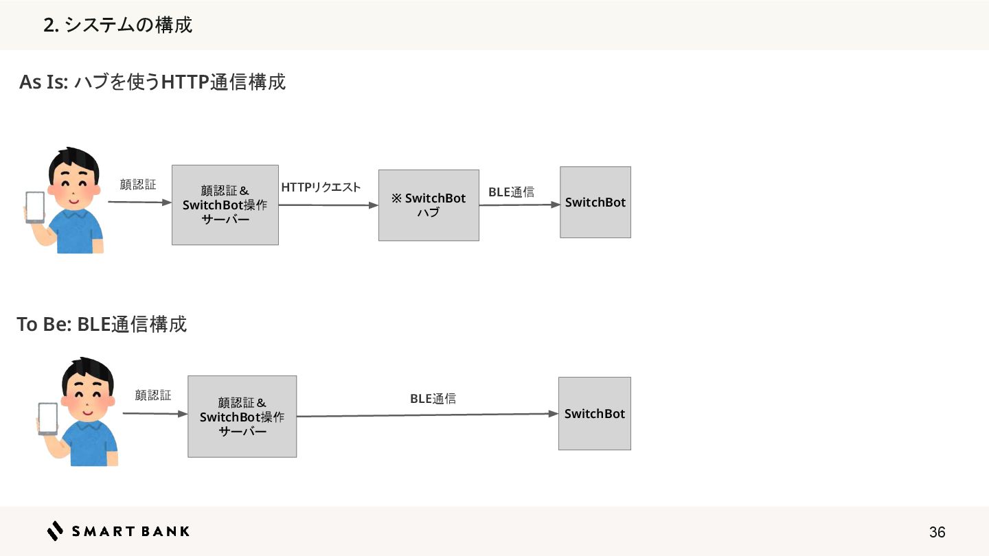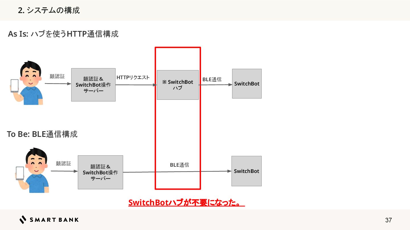 36 2. システムの構成 To Be: BLE通信構成 顔認証 顔認証& SwitchBot操作 サーバー