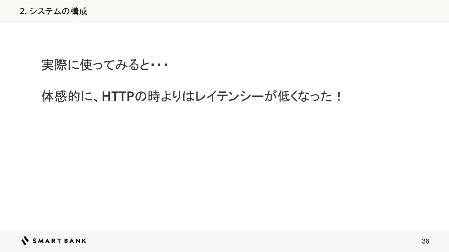 38 2. システムの構成 実際に使ってみると・・・ 体感的に、HTTPの時よりはレイテンシーが低くなった!