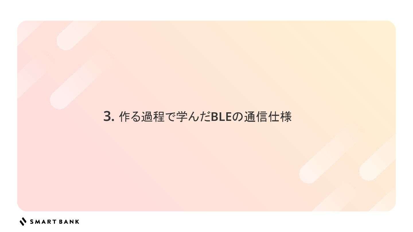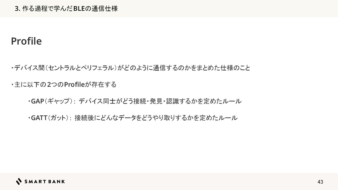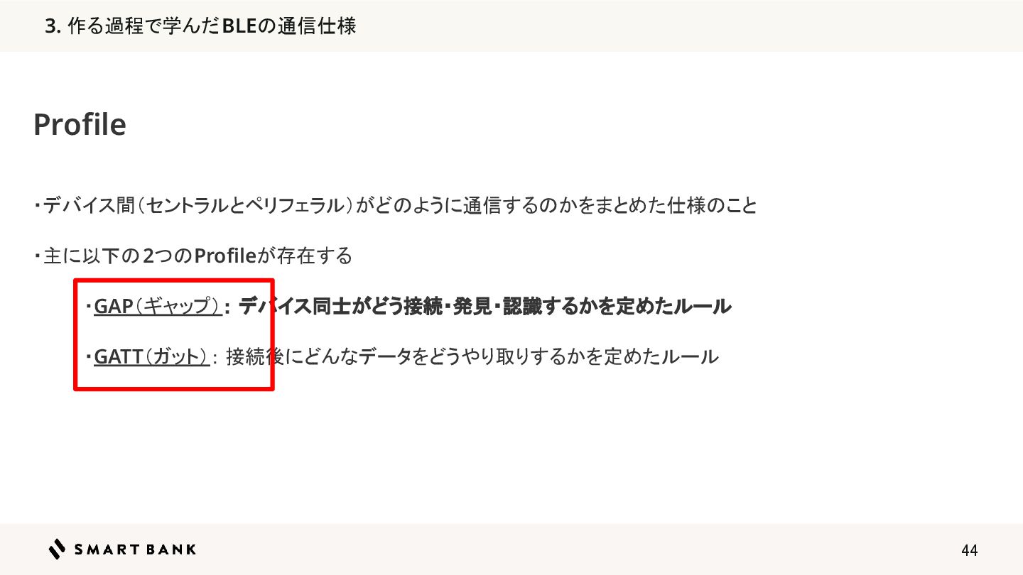 43 3. 作る過程で学んだBLEの通信仕様 Profile ・デバイス間(セントラルとペリフェラル)がどのように通信するのかをまとめた仕様のこと ・主に以下の2つのProfileが存在する ・GAP(ギャップ): デバイス同士がどう接続・発見・認識するかを定めたルール