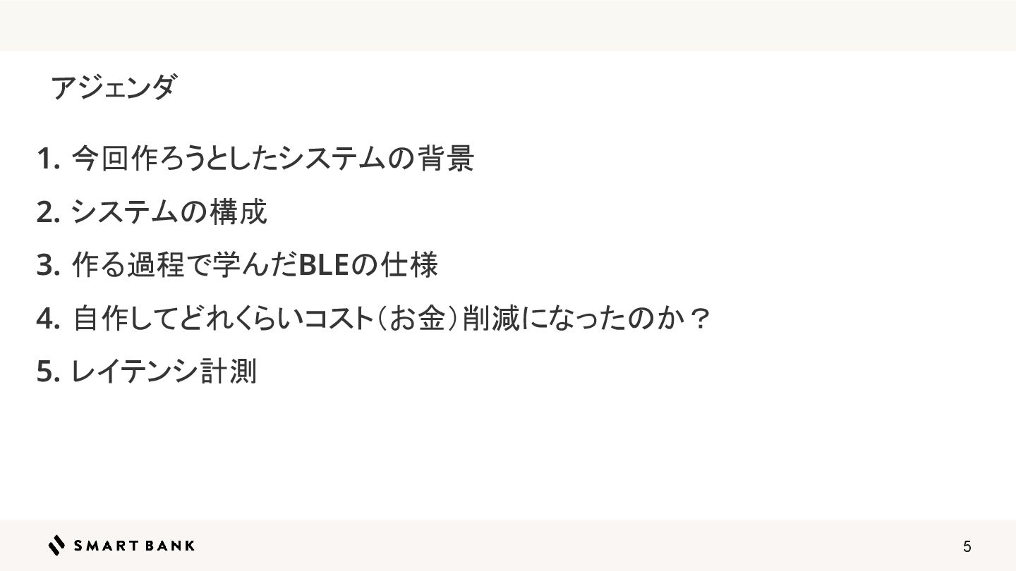 5 アジェンダ 1. 今回作ろうとしたシステムの背景 2. システムの構成 3. 作る過程で学んだBLEの仕様 4. 自作してどれくらいコスト(お金)削減になったのか?