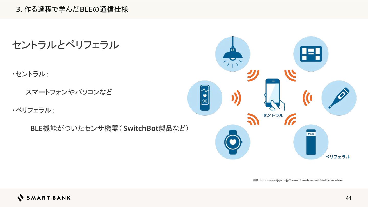 41 3. 作る過程で学んだBLEの通信仕様 セントラルとペリフェラル ・セントラル: スマートフォンやパソコンなど ・ペリフェラル: