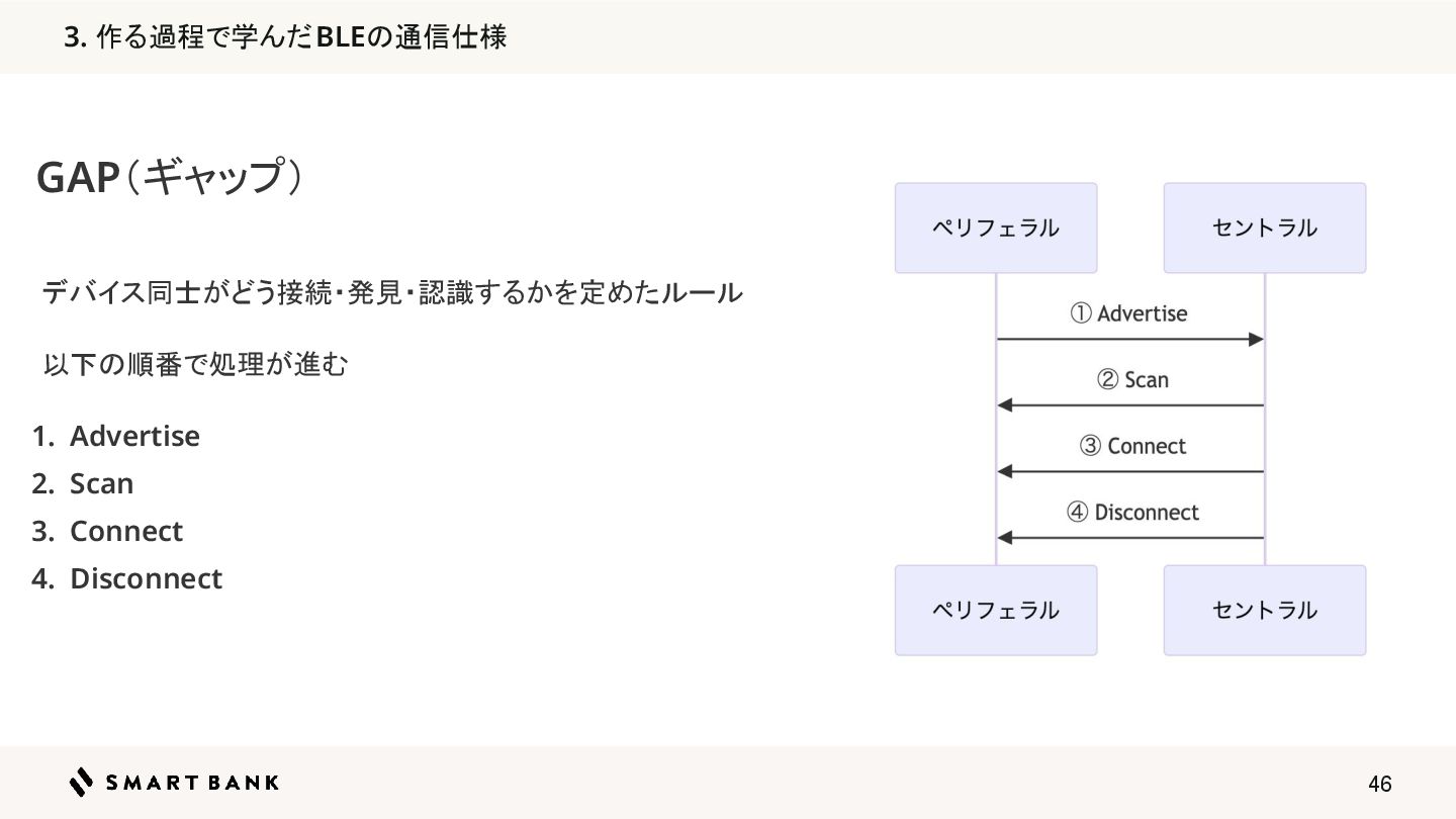 46 3. 作る過程で学んだBLEの通信仕様 GAP(ギャップ) デバイス同士がどう接続・発見・認識するかを定めたルール 以下の順番で処理が進む 1.