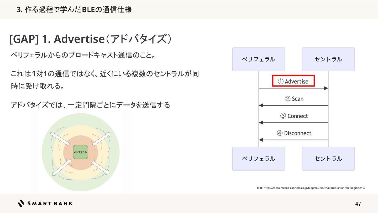 47 3. 作る過程で学んだBLEの通信仕様 [GAP] 1. Advertise(アドバタイズ) ペリフェラルからのブロードキャスト通信のこと。 これは1対1の通信ではなく、近くにいる複数のセントラルが同