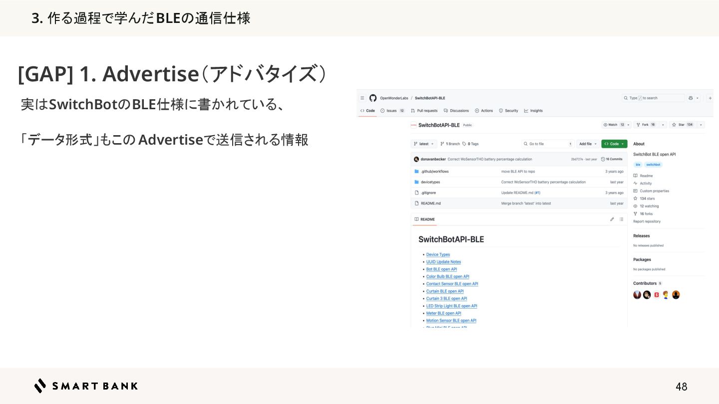 48 3. 作る過程で学んだBLEの通信仕様 [GAP] 1. Advertise(アドバタイズ) 実はSwitchBotのBLE仕様に書かれている、 「データ形式」もこの