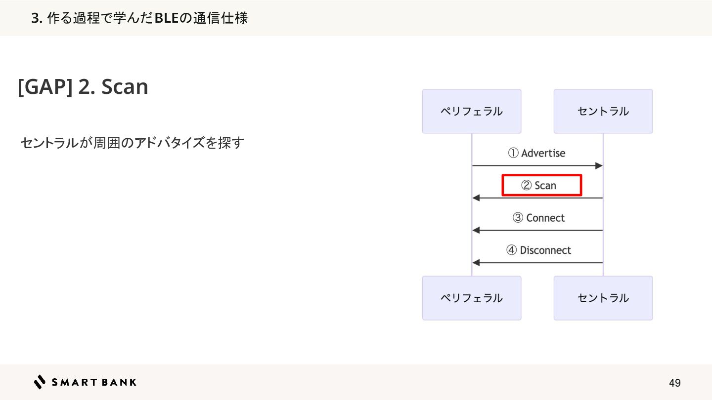 49 3. 作る過程で学んだBLEの通信仕様 [GAP] 2. Scan セントラルが周囲のアドバタイズを探す