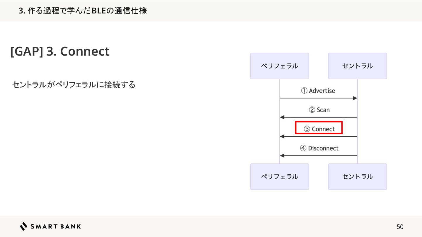 50 3. 作る過程で学んだBLEの通信仕様 [GAP] 3. Connect セントラルがペリフェラルに接続する