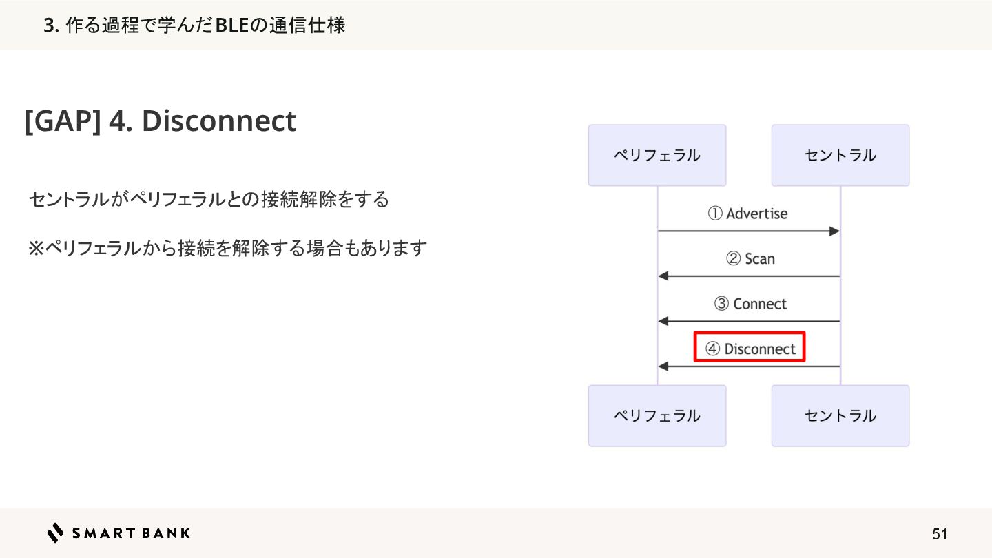 51 3. 作る過程で学んだBLEの通信仕様 [GAP] 4. Disconnect セントラルがペリフェラルとの接続解除をする ※ペリフェラルから接続を解除する場合もあります