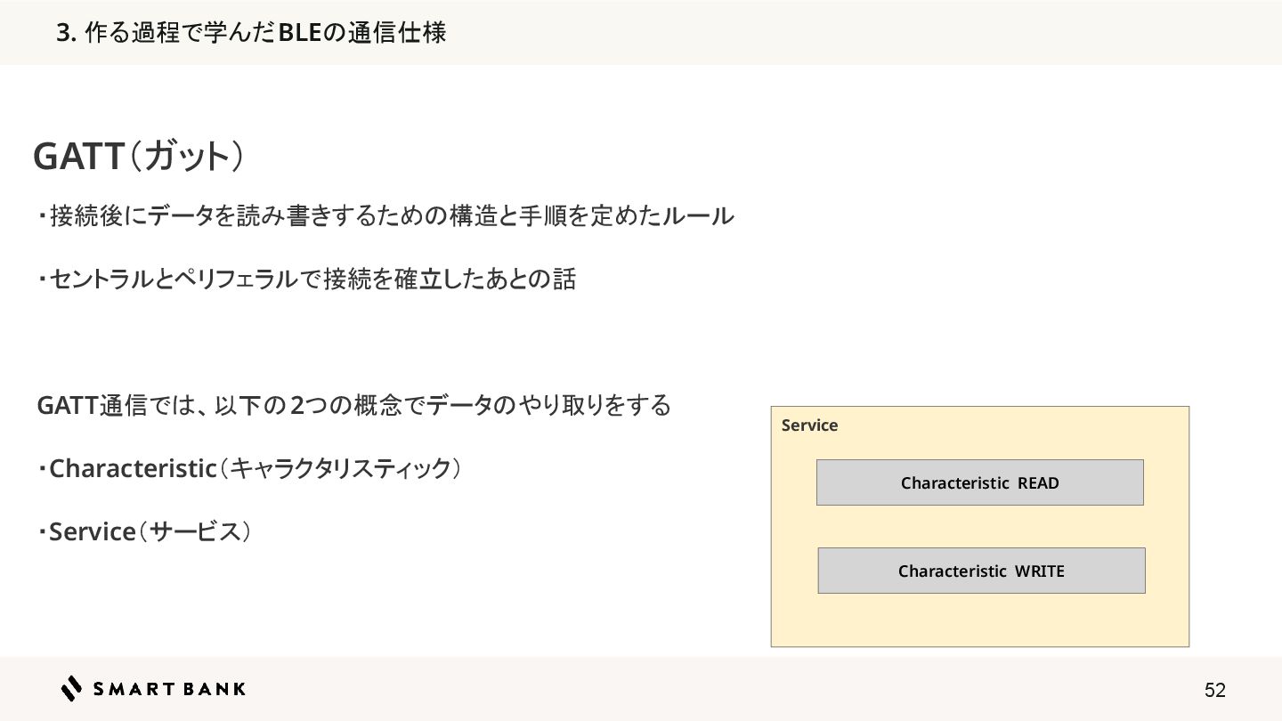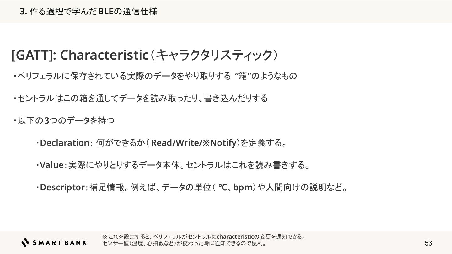 52 3. 作る過程で学んだBLEの通信仕様 GATT(ガット) ・接続後にデータを読み書きするための構造と手順を定めたルール ・セントラルとペリフェラルで接続を確立したあとの話