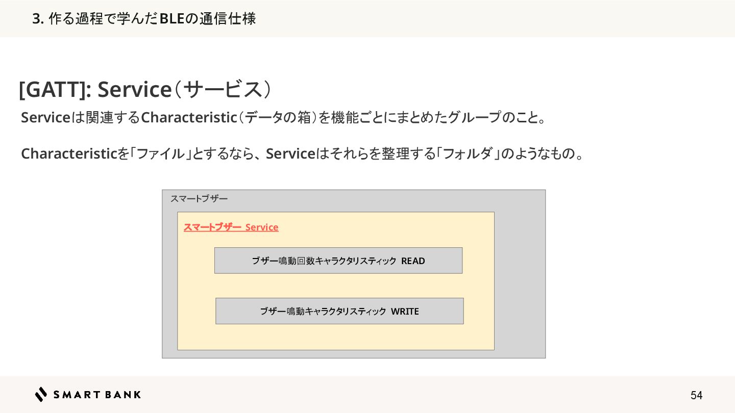 53 3. 作る過程で学んだBLEの通信仕様 [GATT]: Characteristic(キャラクタリスティック) ・ペリフェラルに保存されている実際のデータをやり取りする “箱”のようなもの ・セントラルはこの箱を通してデータを読み取ったり、書き込んだりする